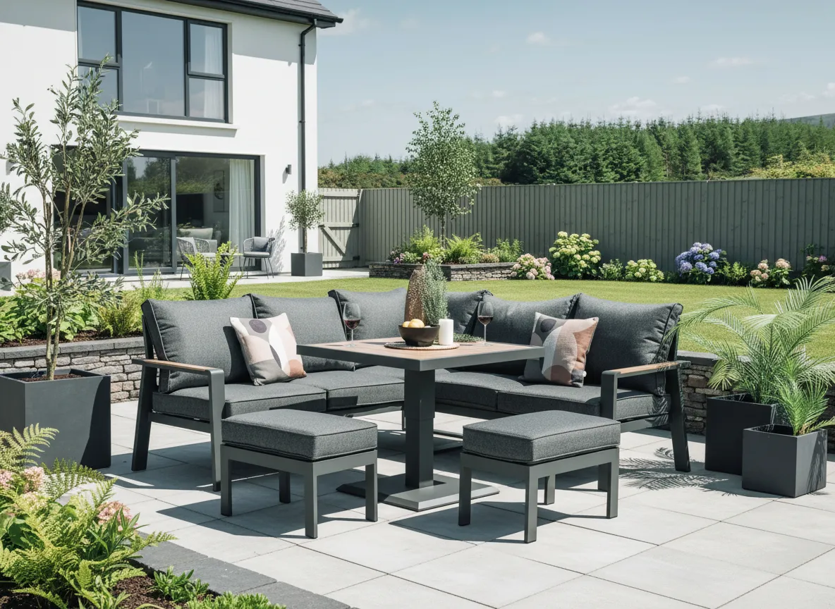 A grey corner sofa set with fireproof cushions, 2 stools and a fixed rectangular table which caters for 6-9 people outdoors.