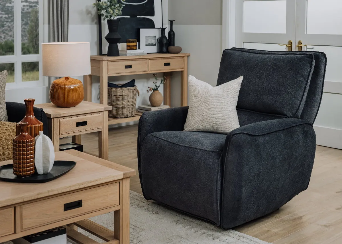The Quentin Power Recliner is a zero gravity design recliner, with arm-filled seat cushions, fibre-filled back cushions and 100% steel heavy gauge sinuous spring suspension