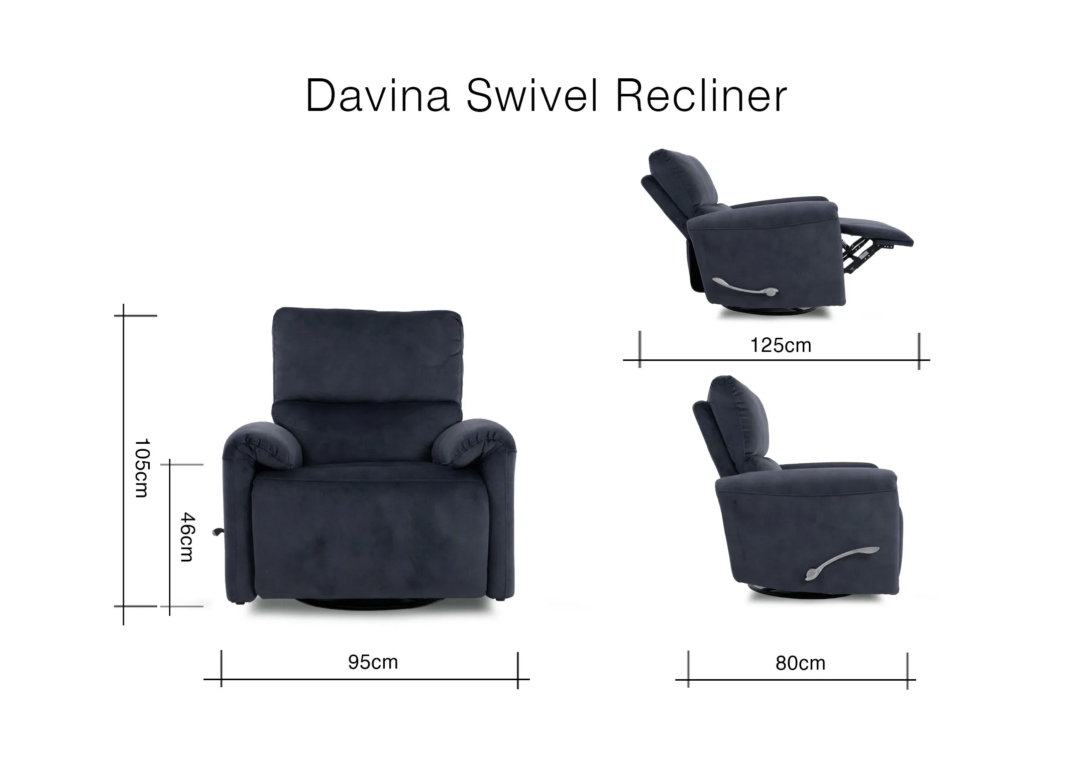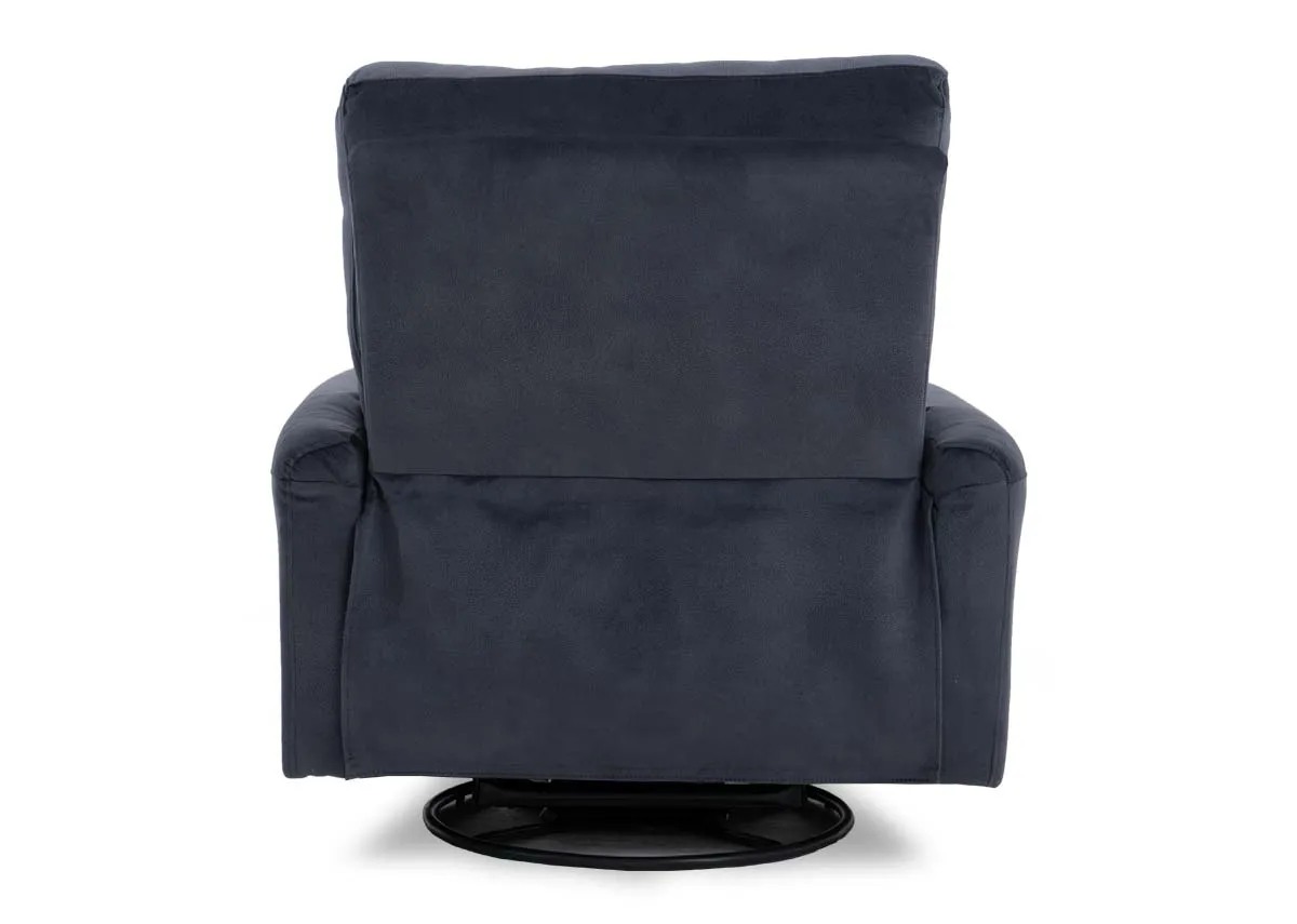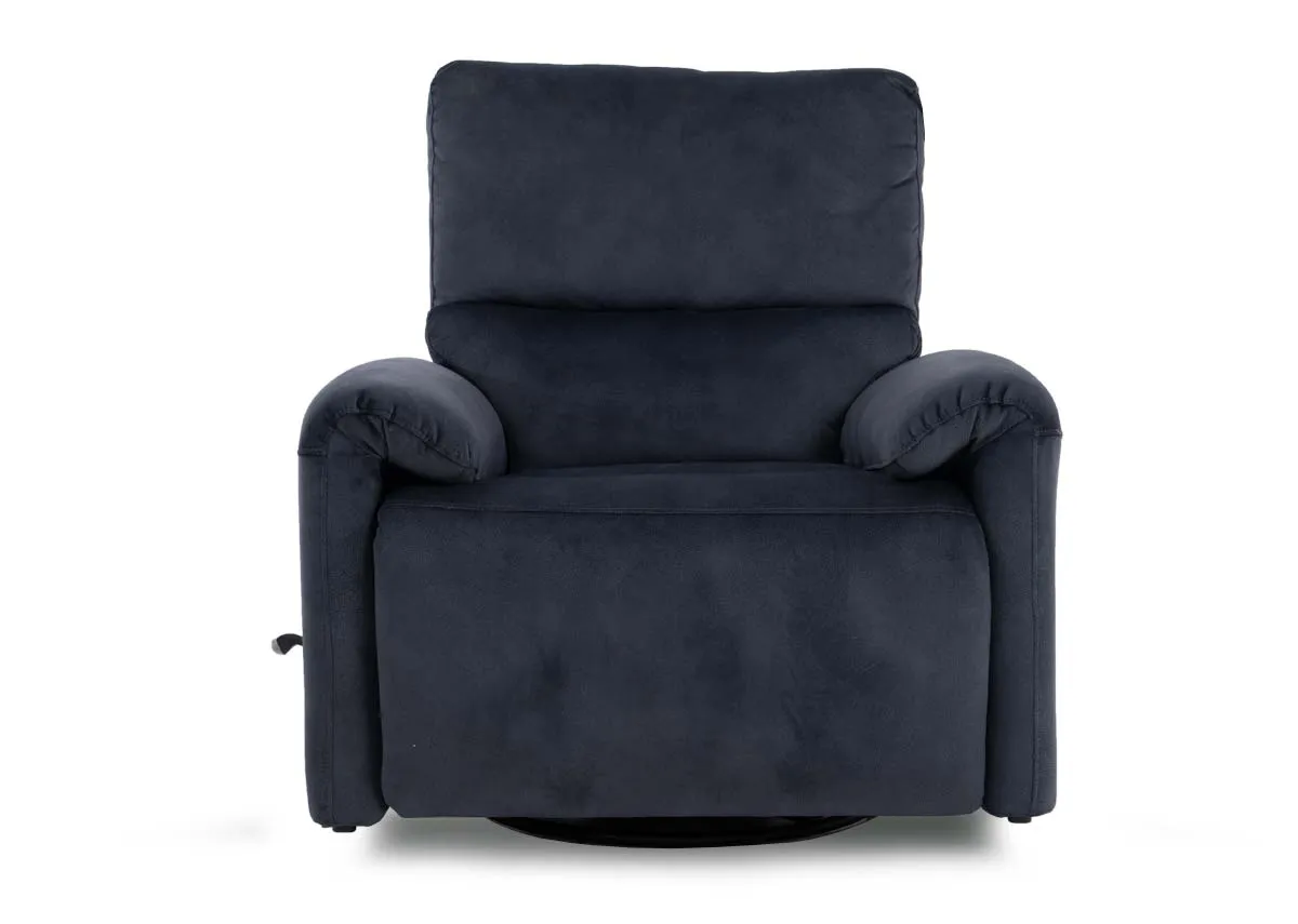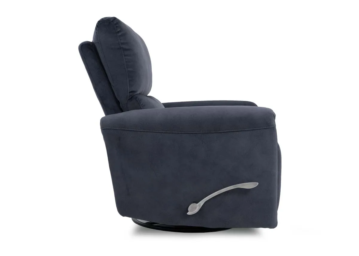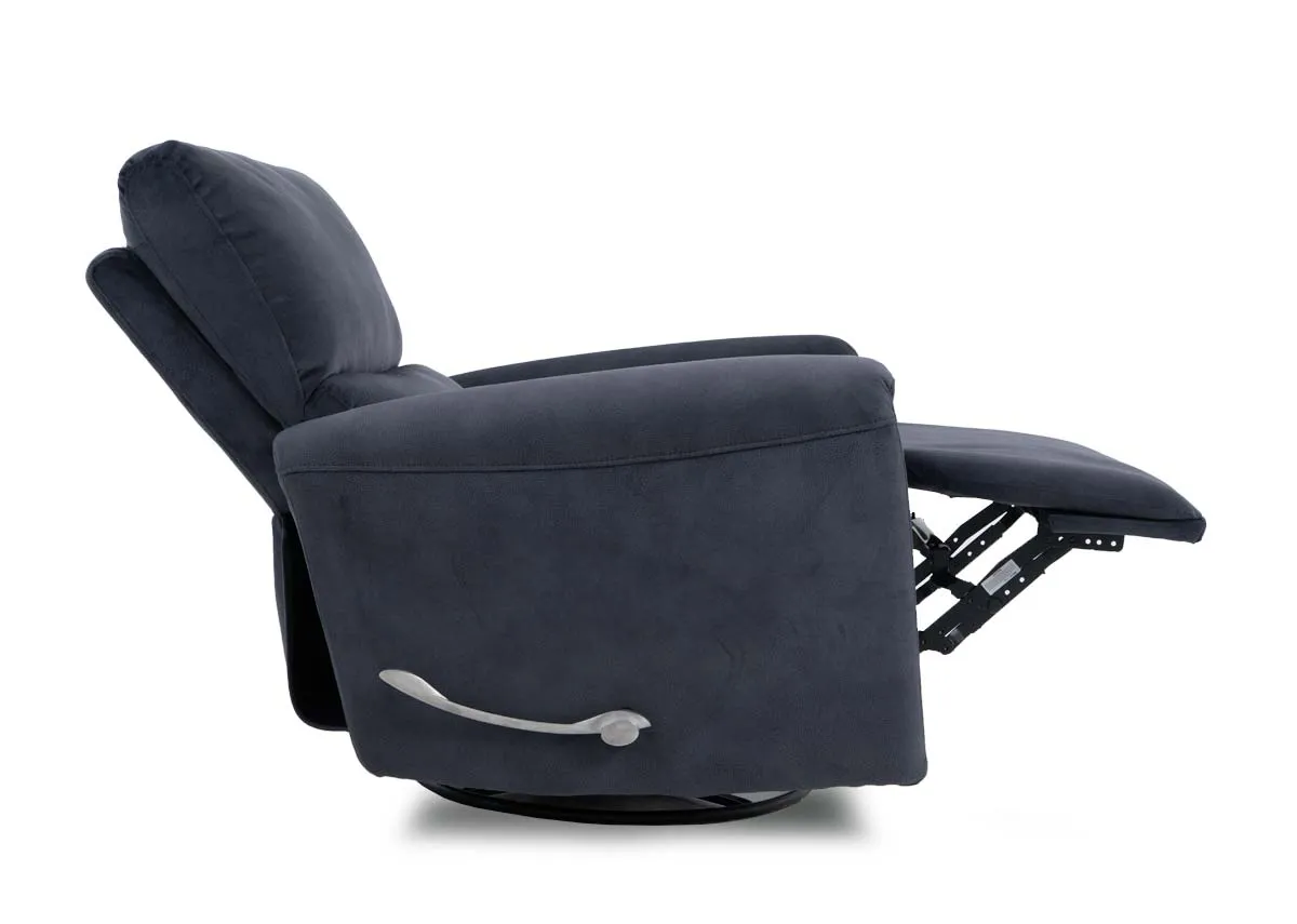 A grey fabric recliner with swivel base, ideal for relaxing as a recliner and handy for ease of movement.