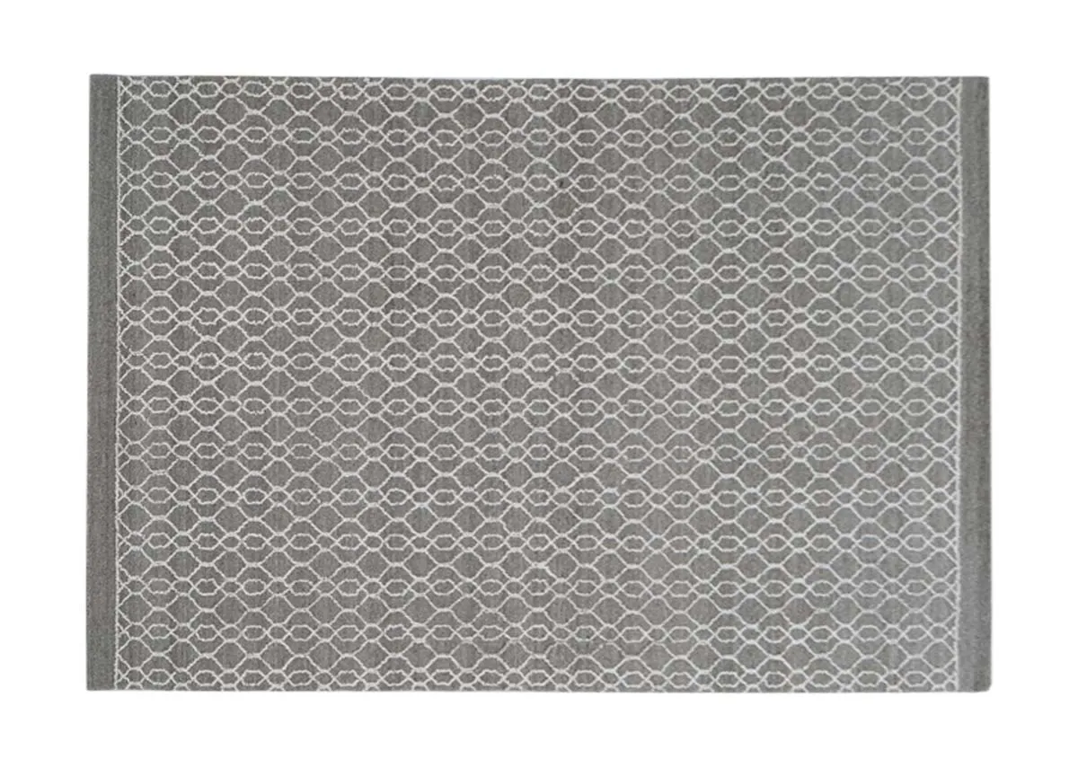 A grey small rug with an ivory woven thread design in a honeycomb pattern.