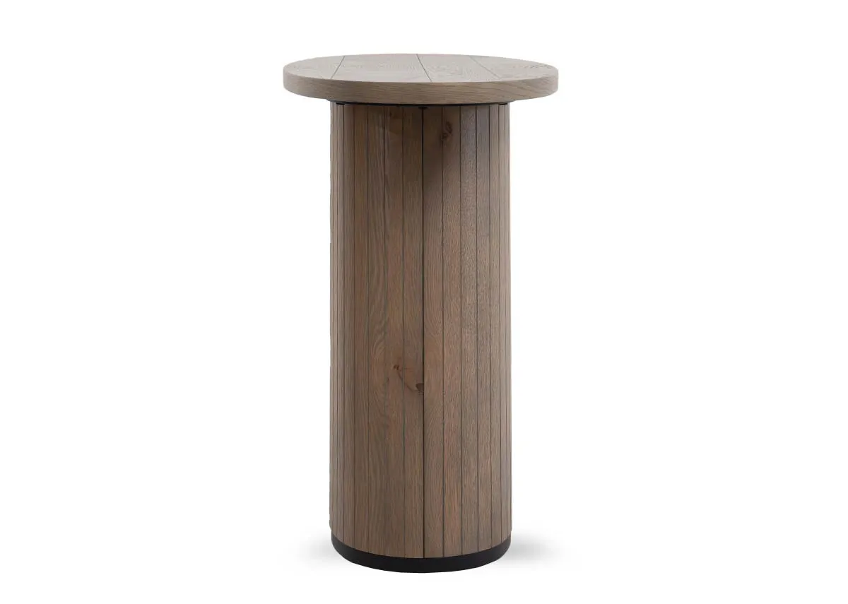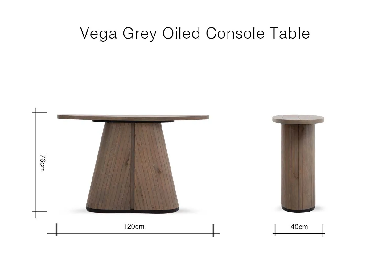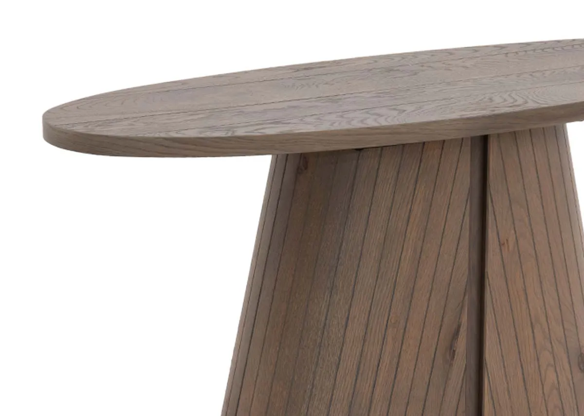 A long oval console table with grey oiled veneer and wire brushed oak finish top with wide pedestal base.
