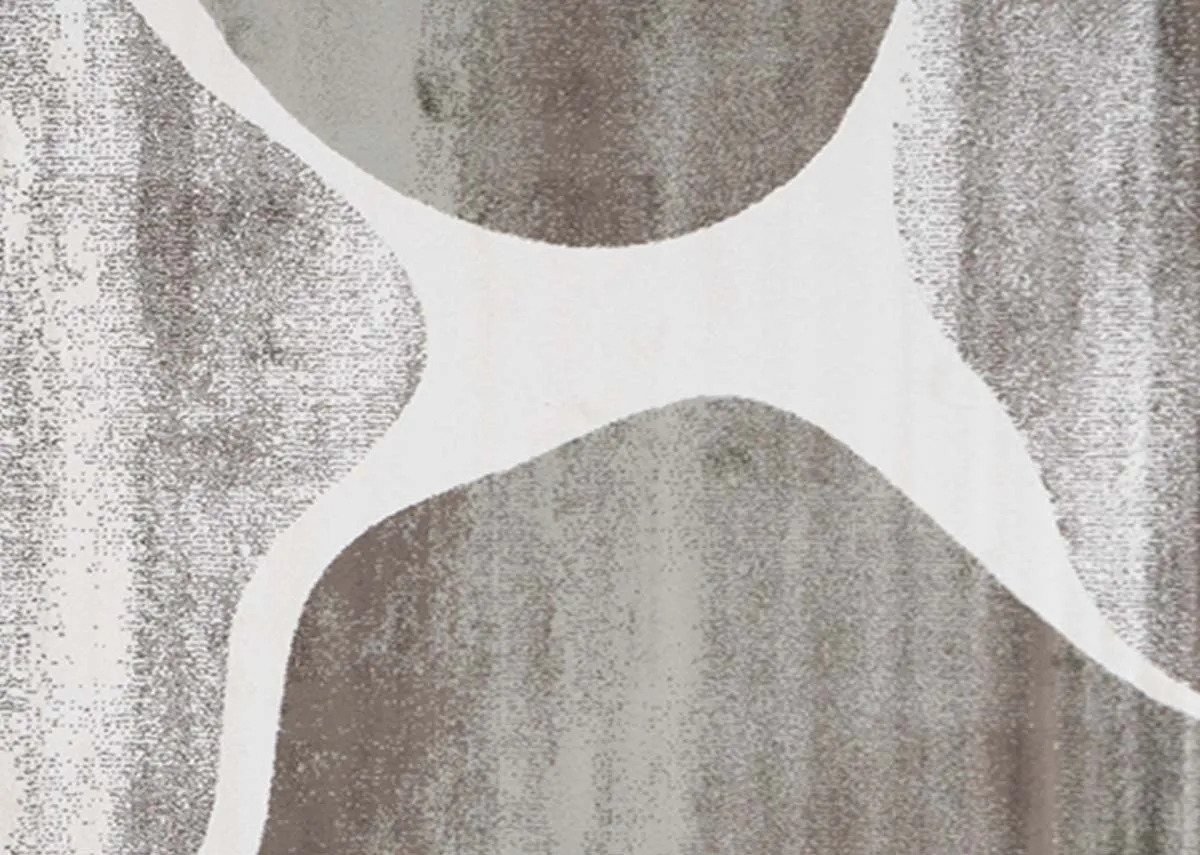 A grey textured pile rug with a wave curved print imitating a watermark, interersting and sure to add a stylish touch to your space.