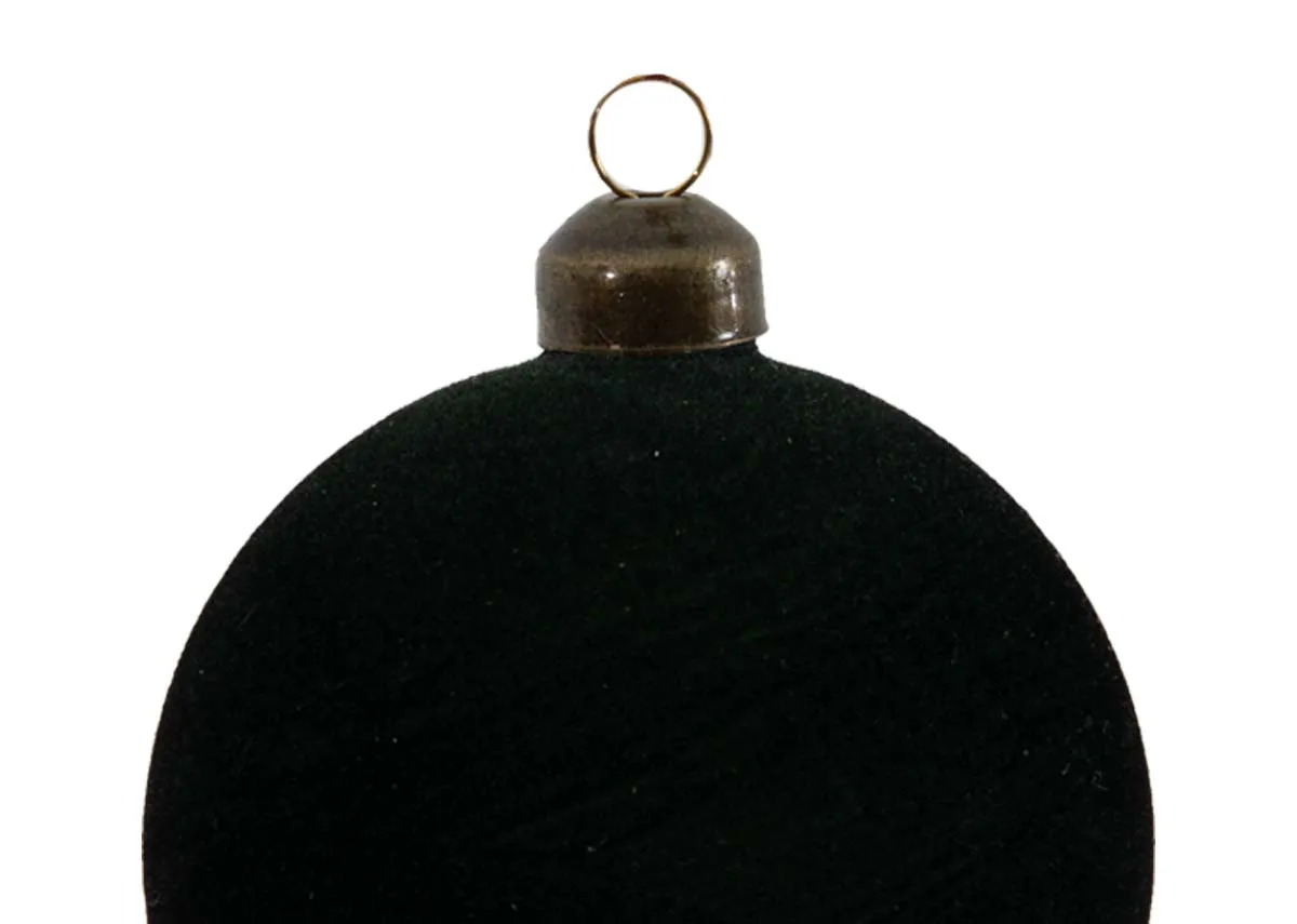 A set of four traditional globe shaped 10cm baubles in striking dark green velvet with antique gold cap.