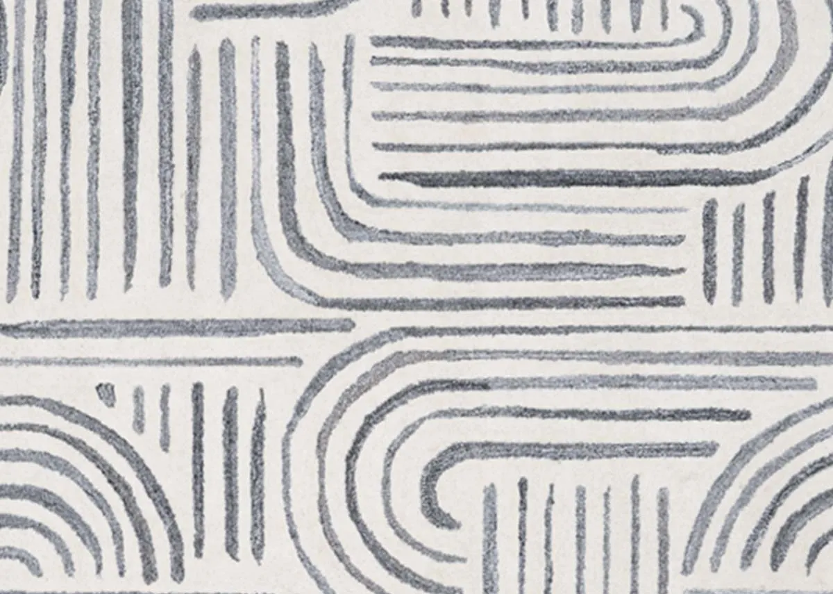 A small 120cm x 170cm ivory rug with grey geometric swirls and abstract textile design that would suit modern and bohemian interiors.