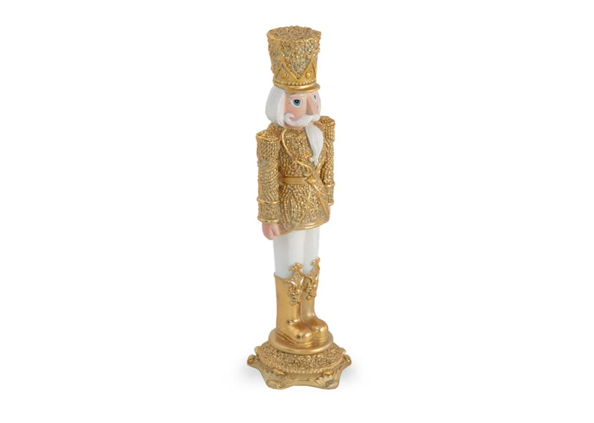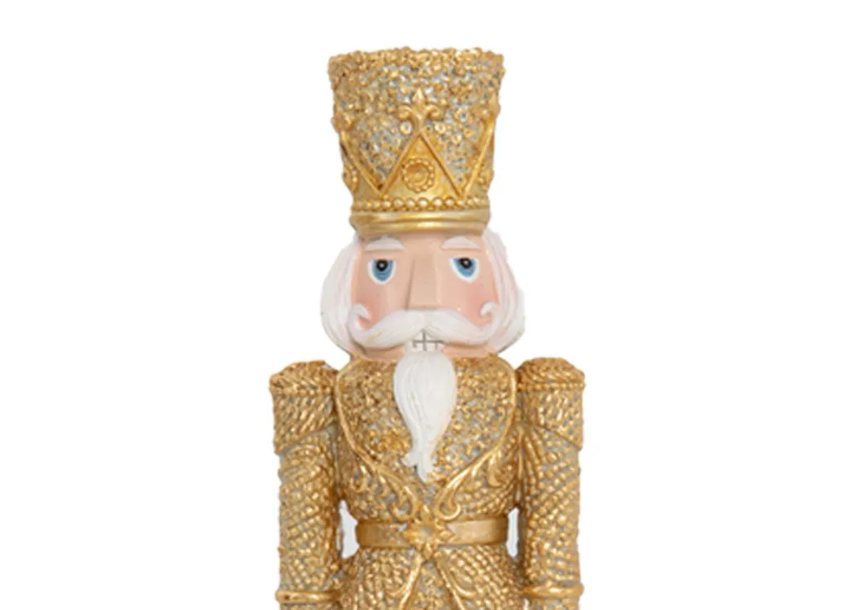 Dressed in sparkling gold attire this regal King of the Nutcrackers comes on a gold base.