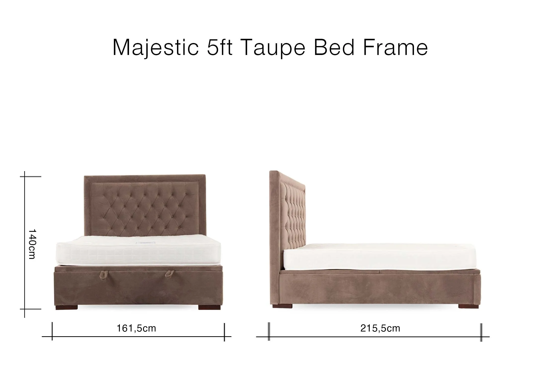 The Majestic Ottoman Taupe 5ft Bed Frame combines elegance, practicality, and hidden storage, offering a multifunctional piece for a guest bedroom or master suite.