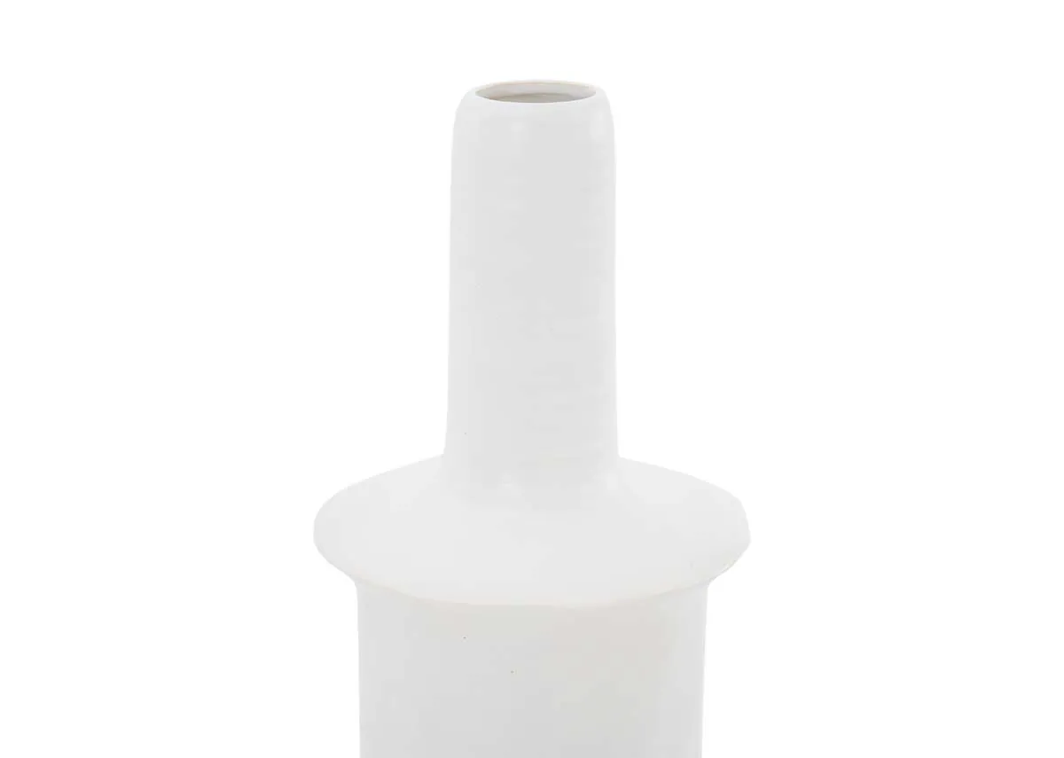 A large bottle shaped white vase with sharp angles, adding a layer of texture to a simple piece.
