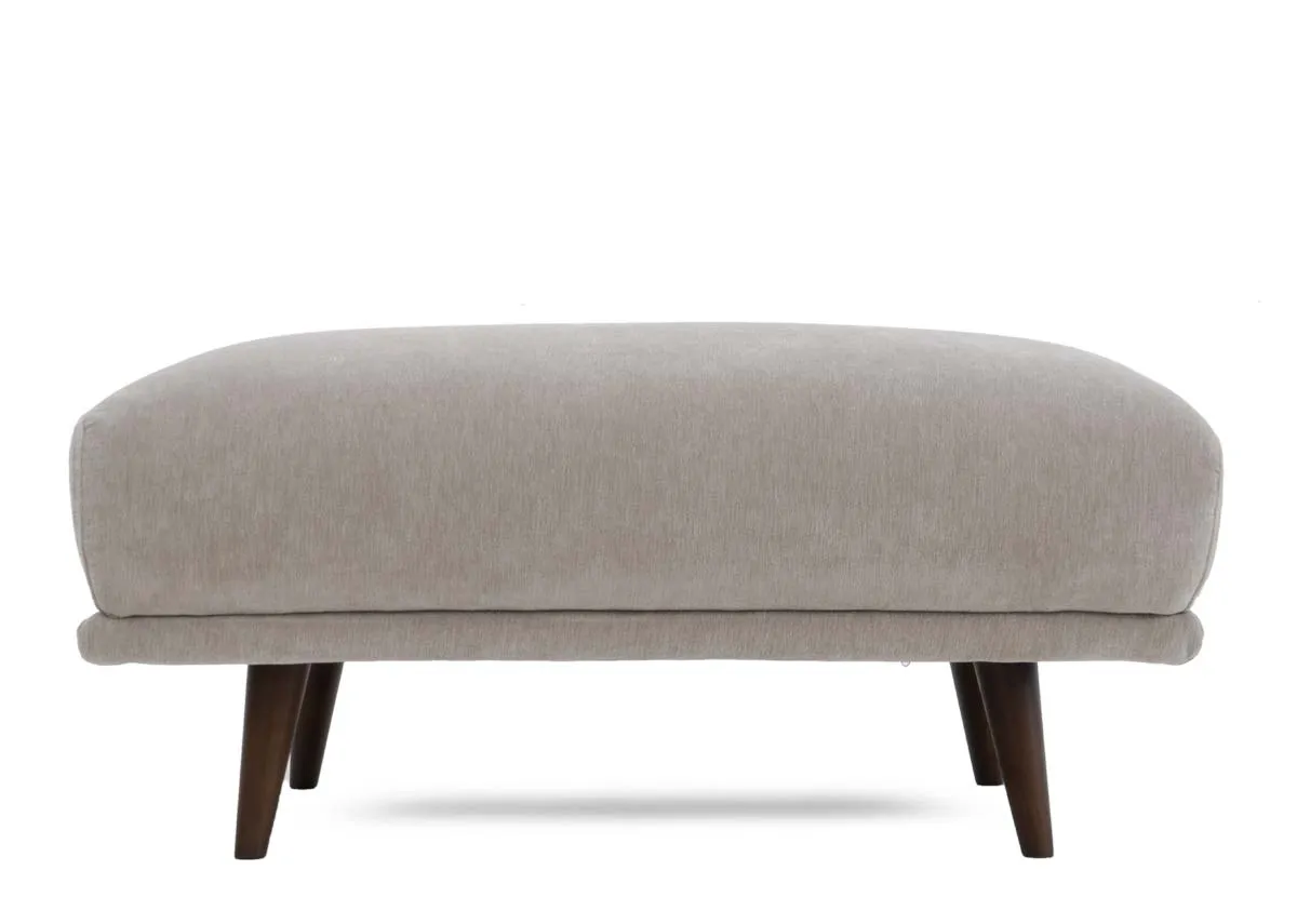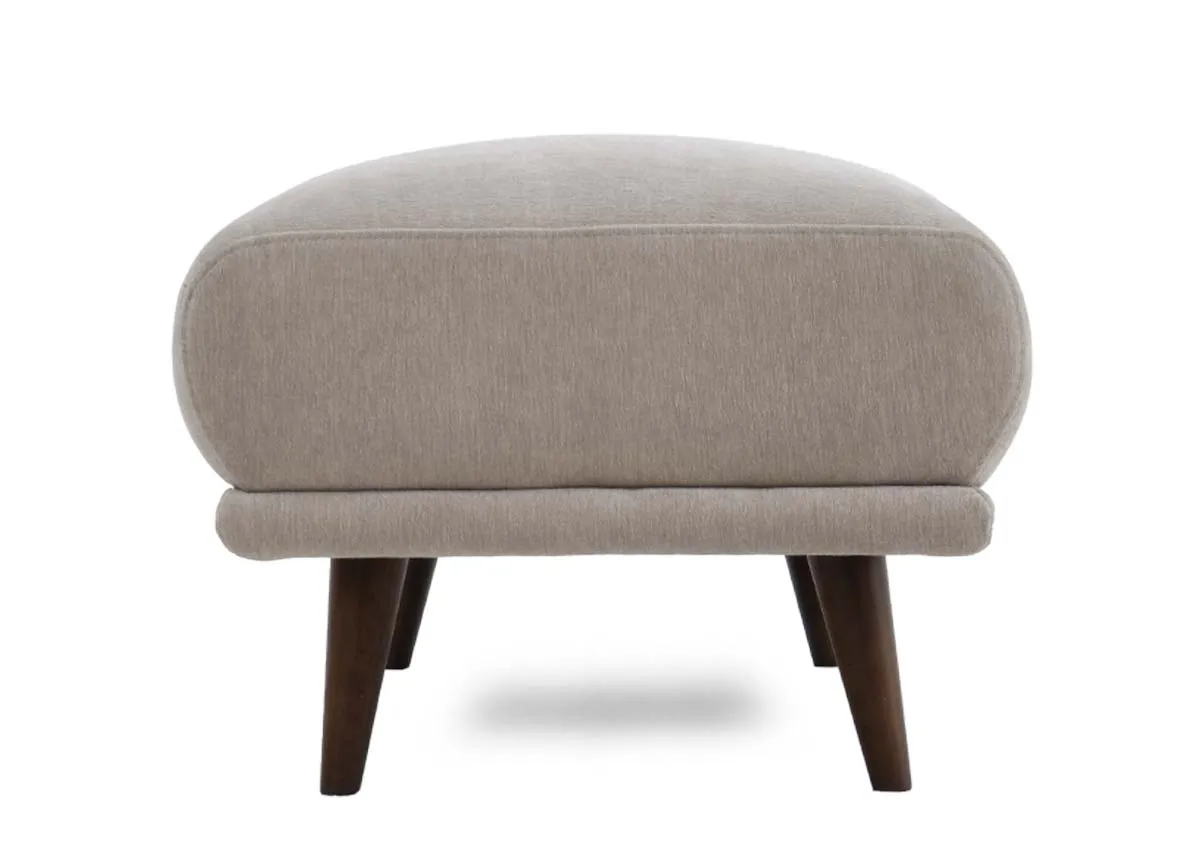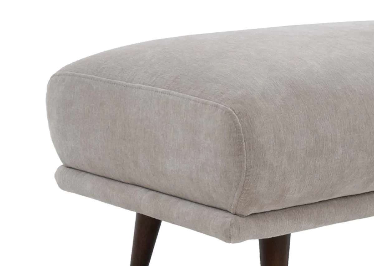 A rectangular footstool in a soft silver fabric with dark brown wood feet, large enough to use as a spare seat.