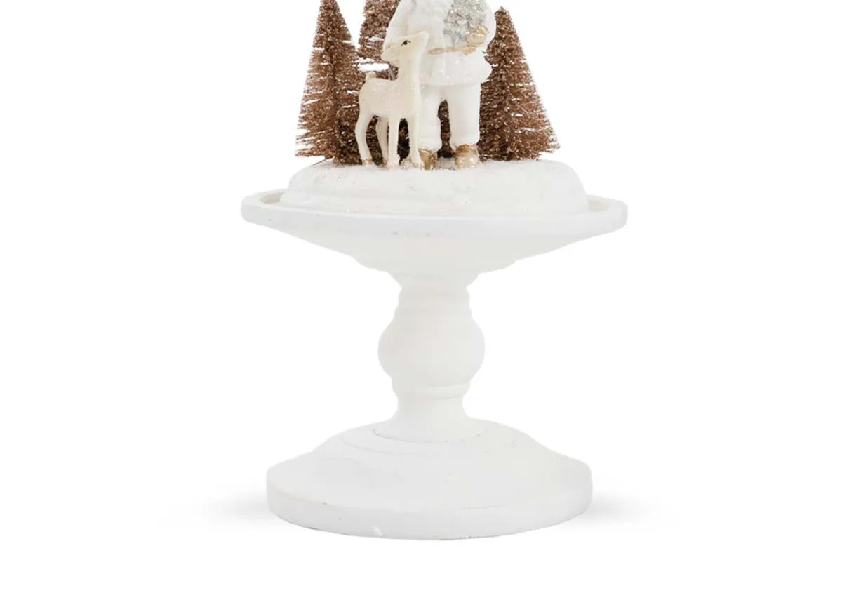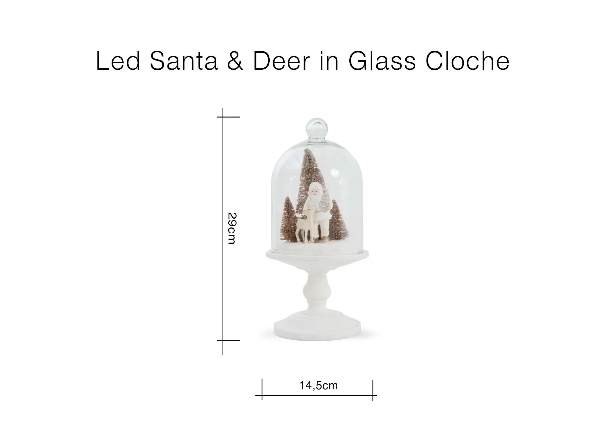 Three fir trees form the backdrop for Santa and his reindeer in the striking LED ornamental glass cloche.