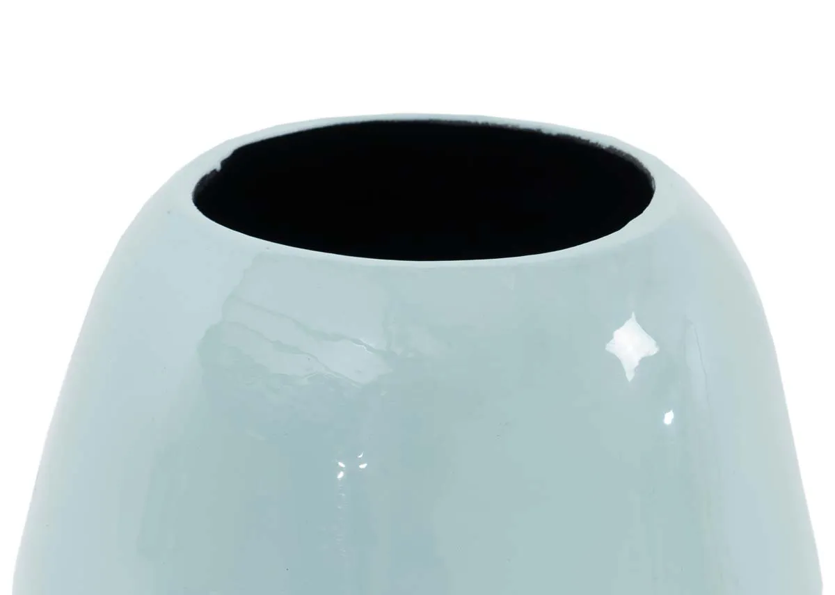 A round aluminium vase in a glossy finish, painted in the lightest pastel blue making it ideal for living or bedroom decor.