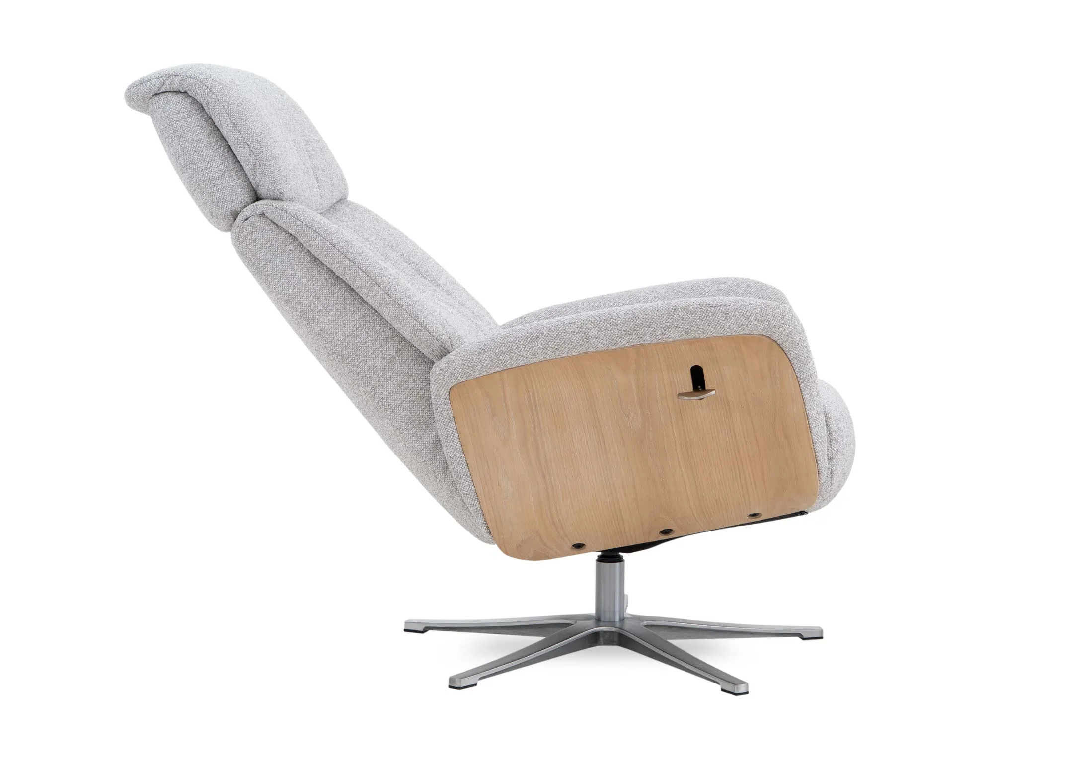 A light grey fabric recliner chair with matching footstool for ultimate relaxation in your home, also a swivel chair, movement is simple and comfy.