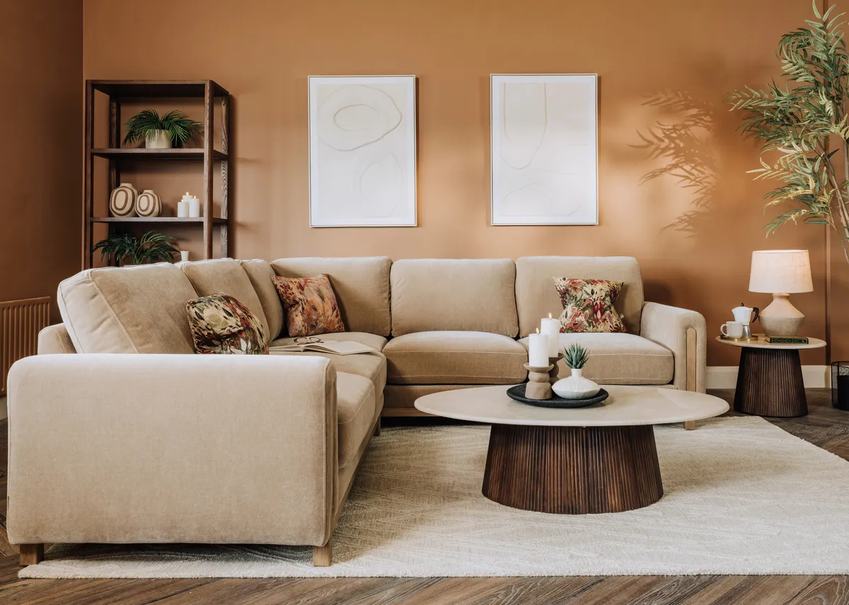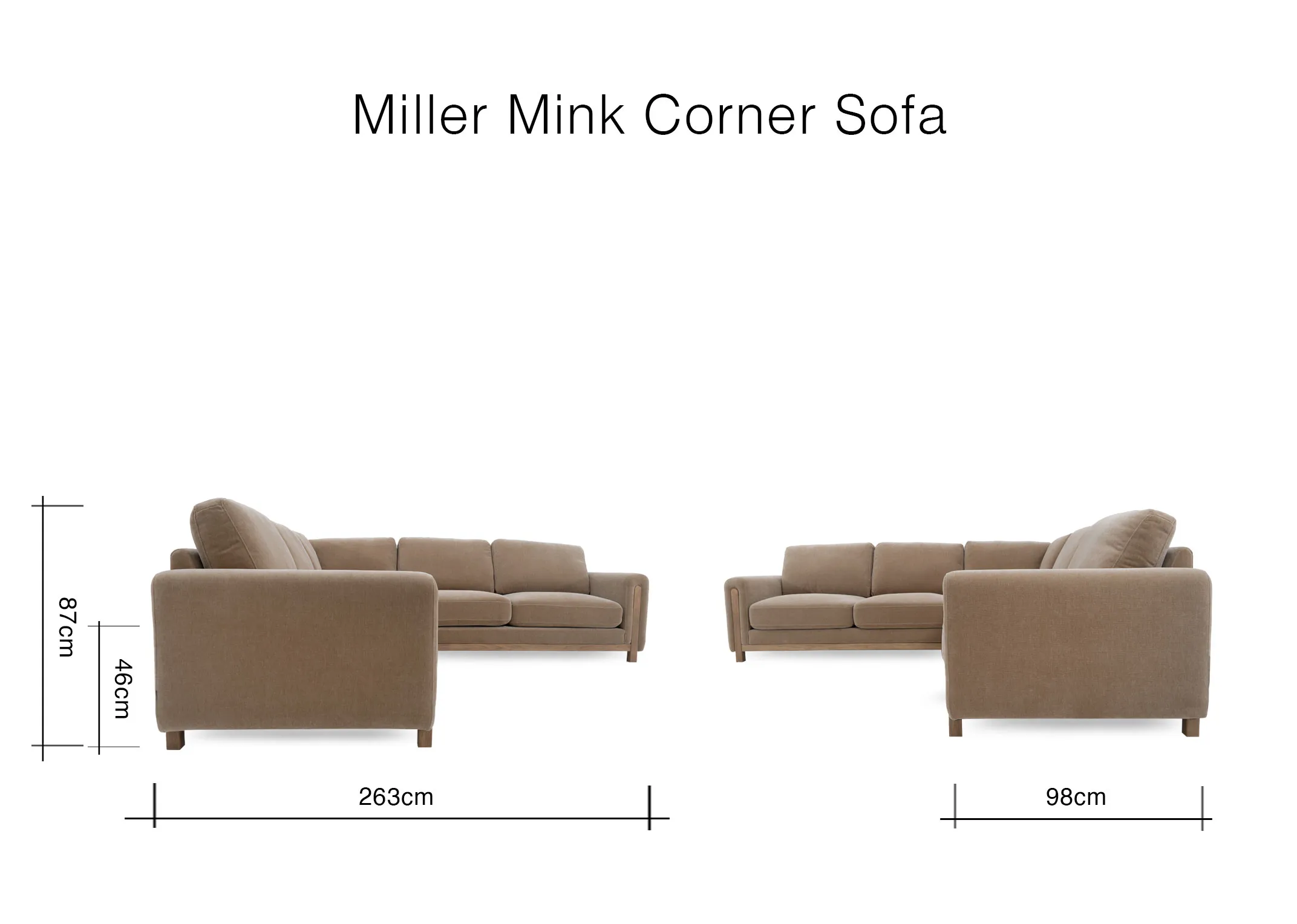 An oversized mink fabric corner sofa, soft to the touch, retro inspired, its a show stealer.