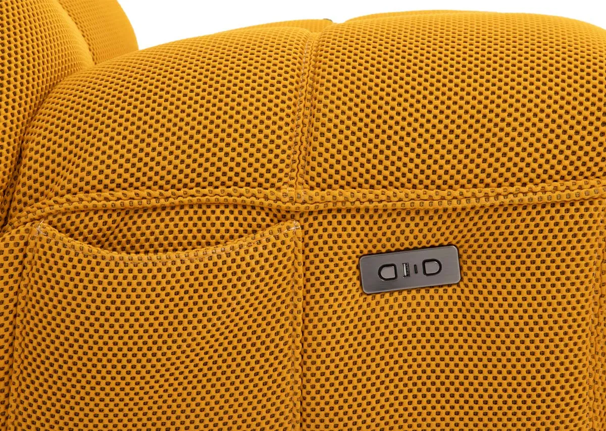 A mustard yellow fabric power gliding gaming chair with thick foam filled seat for added comfort, a side pocket for remotes and handsets, usb charging port and a hands free phone holder.