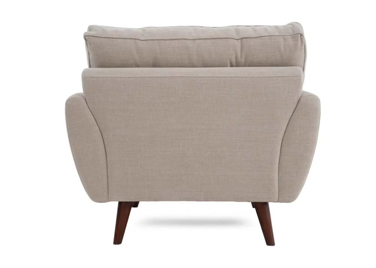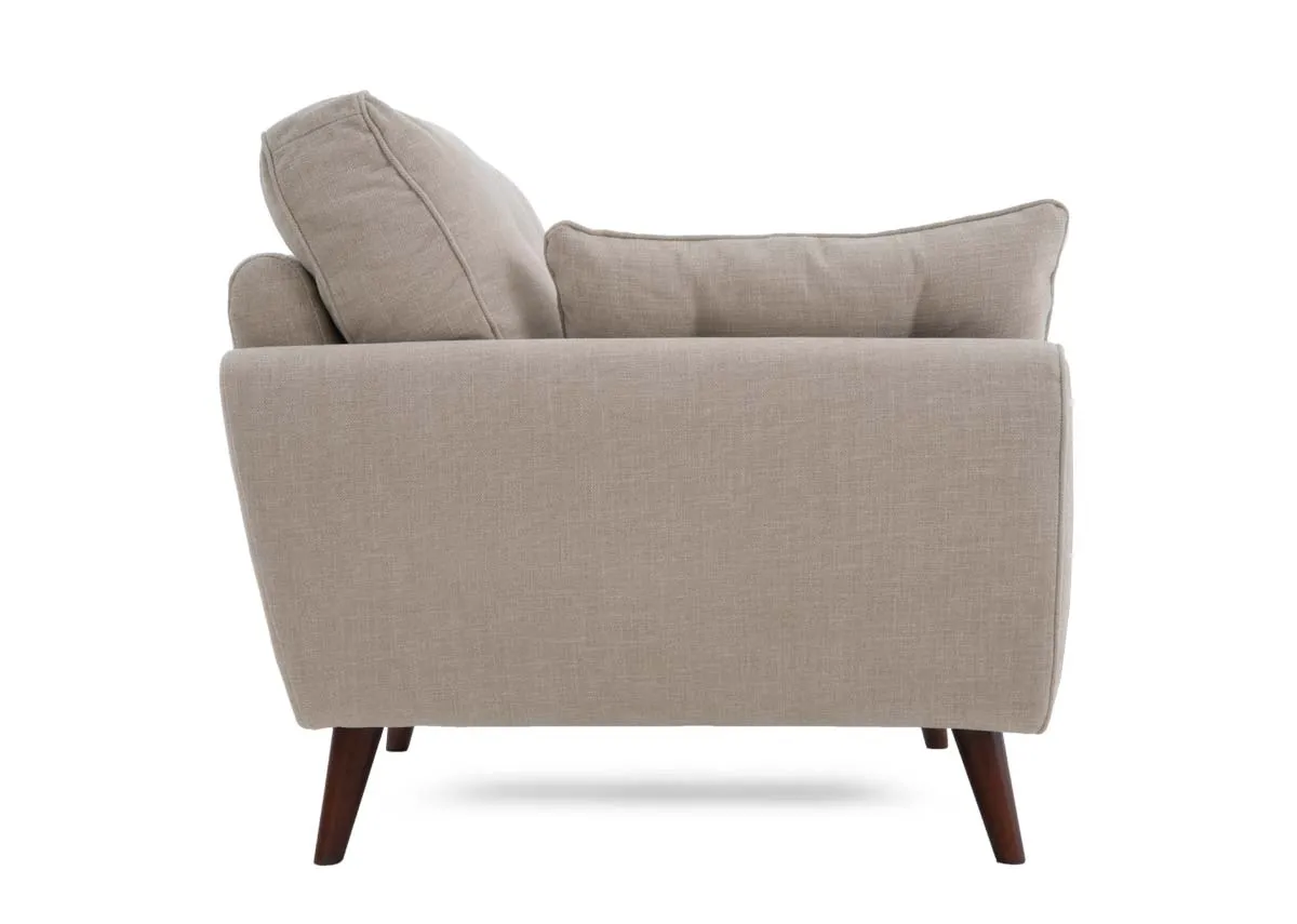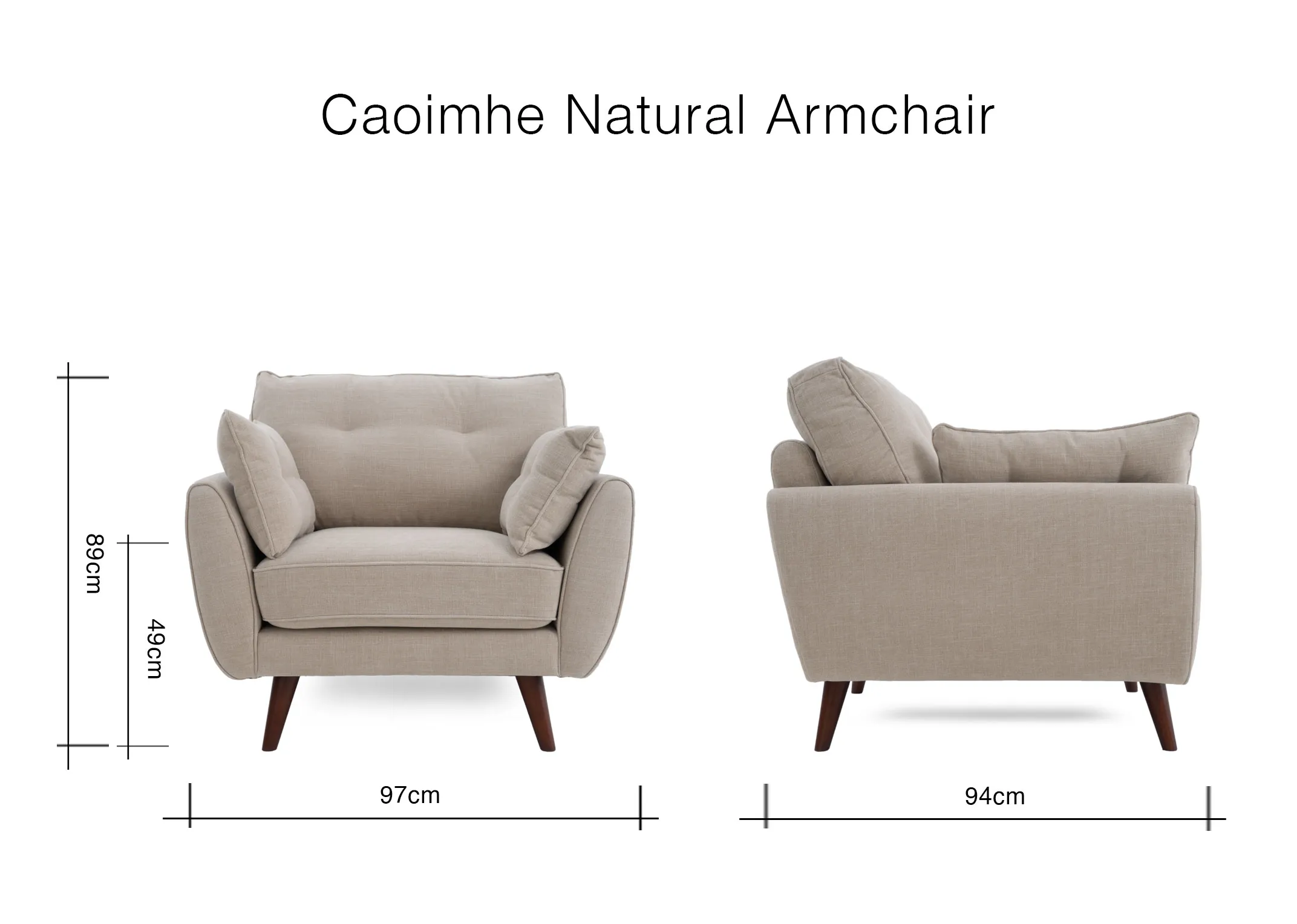 Neutral in natural fabric the Caoimhe armchair boasts plush foam cushions, on-trend design and retro walnut feet for style & comfort.