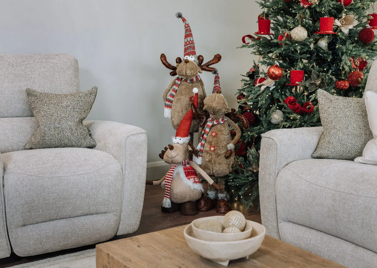 A charming Noel reindeer fabric character featuring festive hat & scarf with telescope legs.