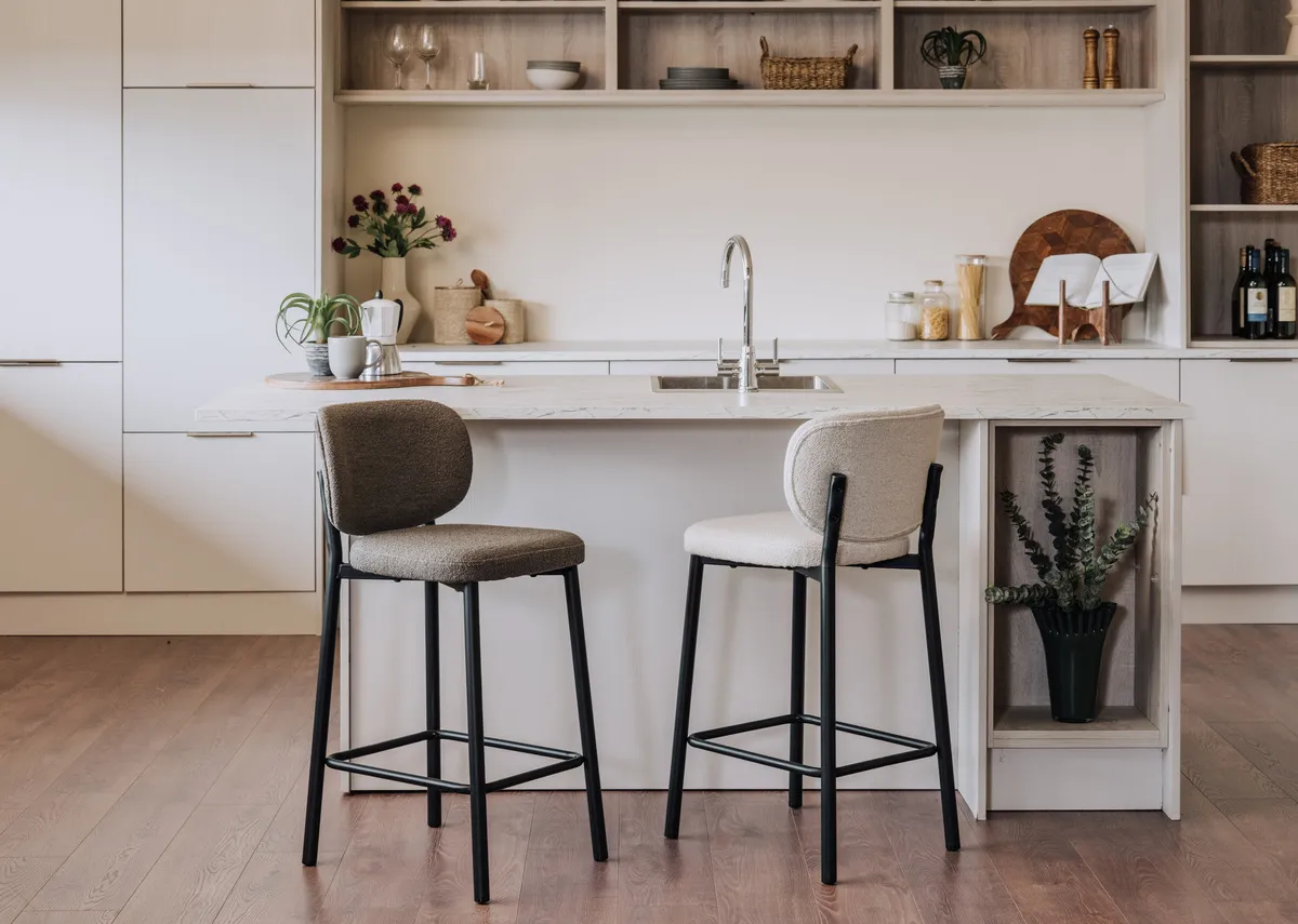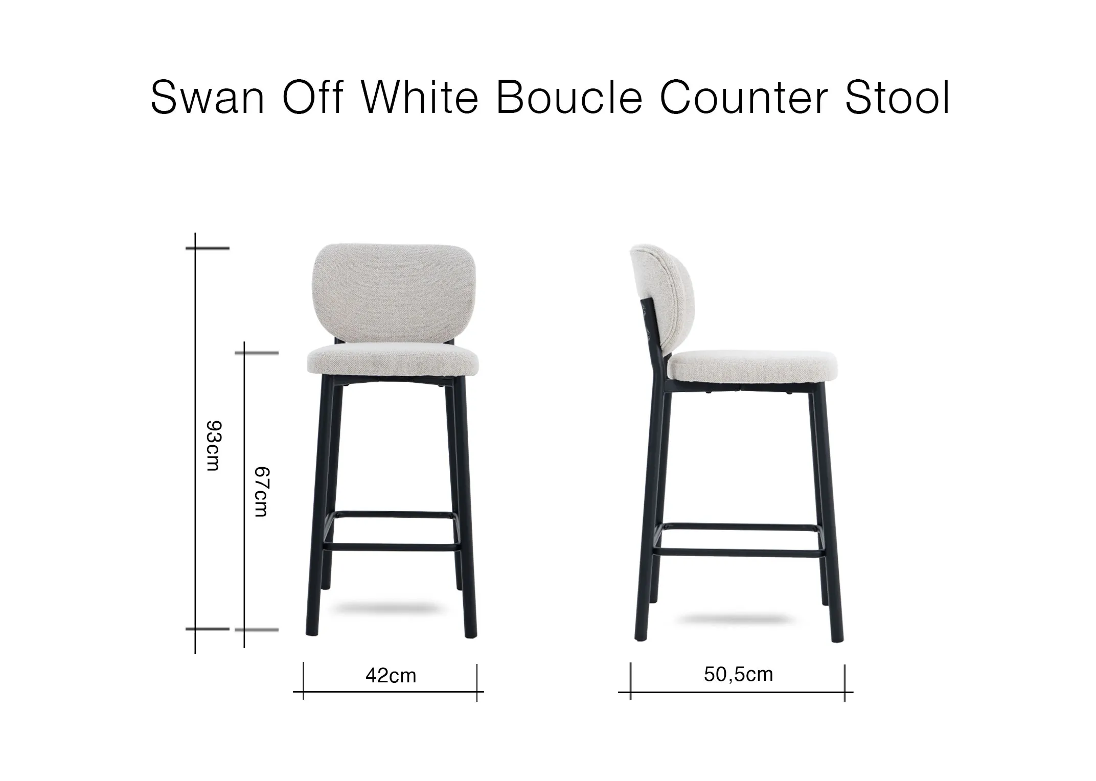The Swan counter bar stool boasts a metal frame with off white textured upholstery, comfy and stylish.