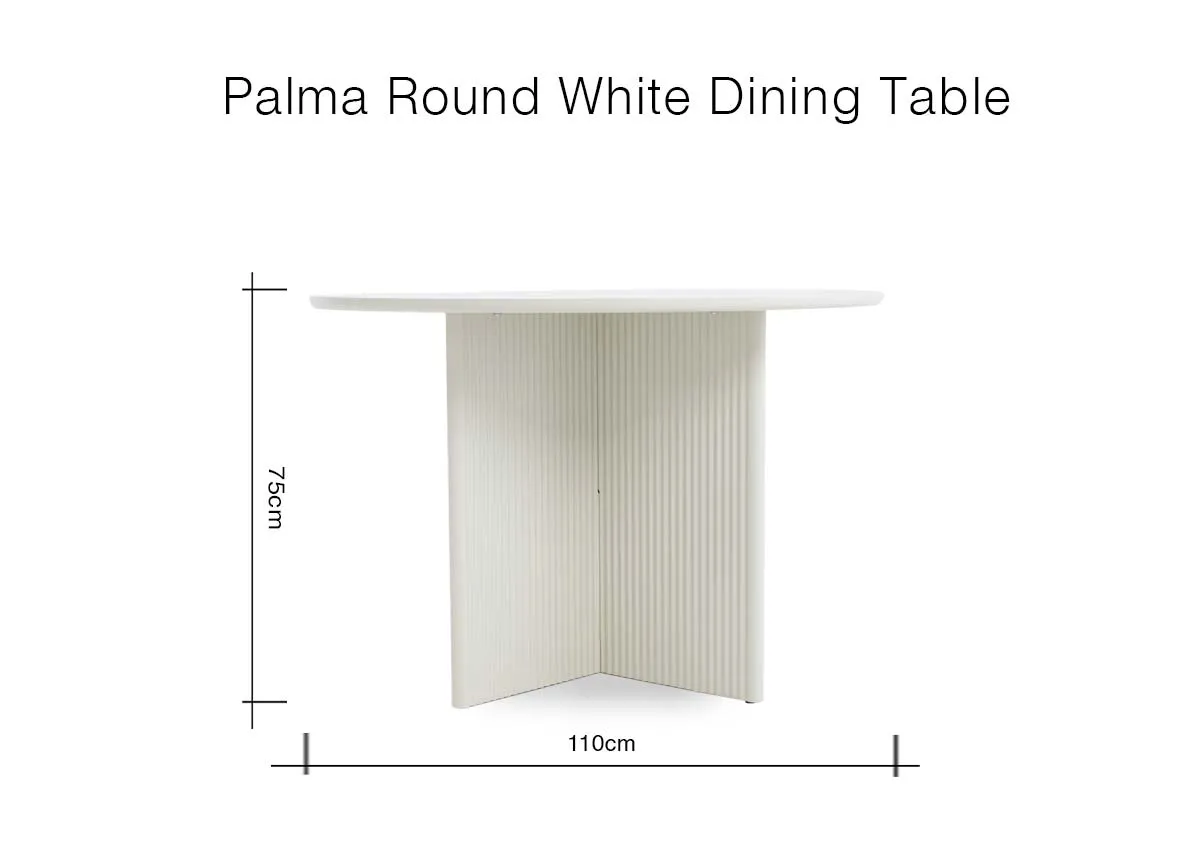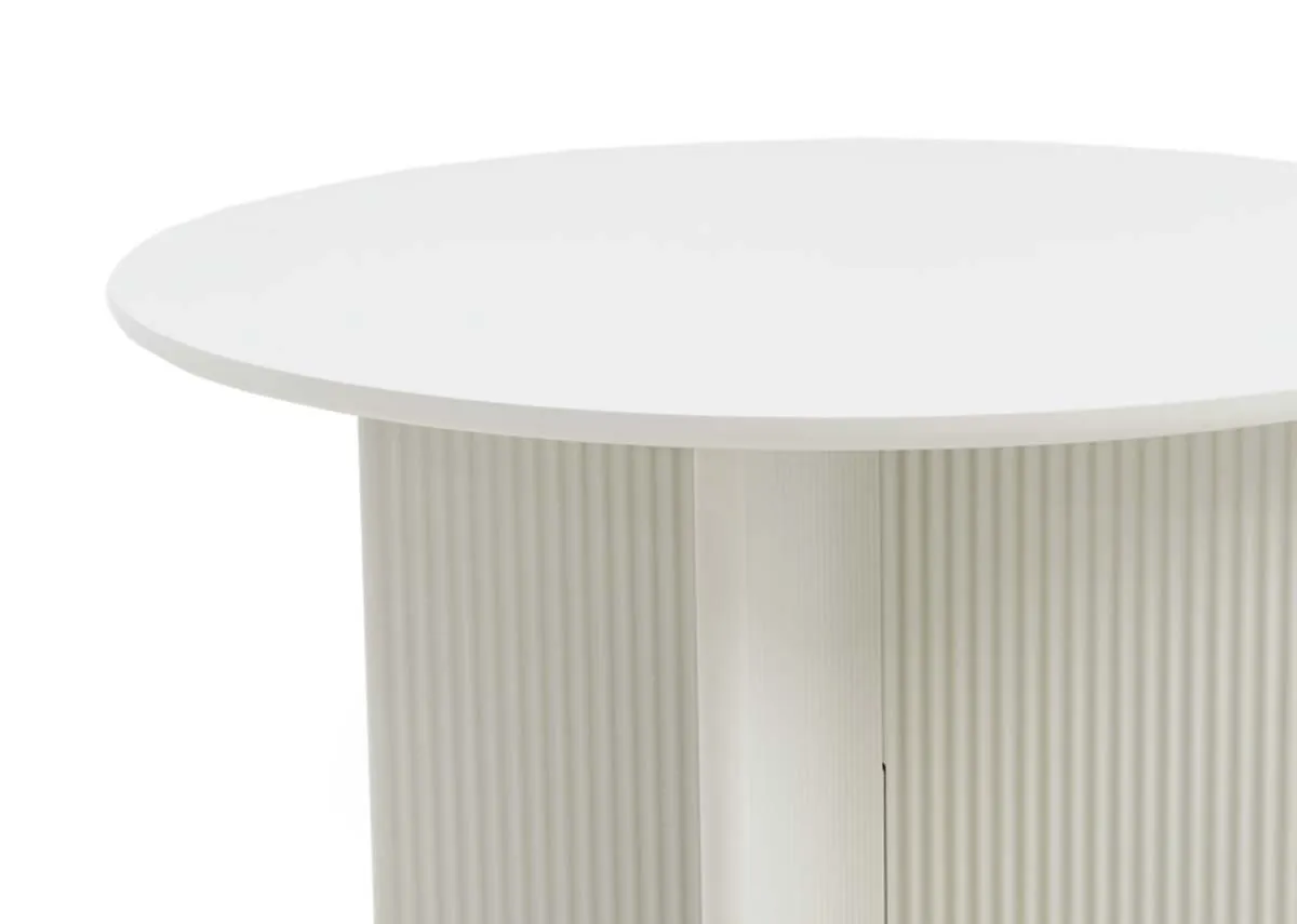 An off white pine mix round dining table with slatted wide base legs and sleek table top.