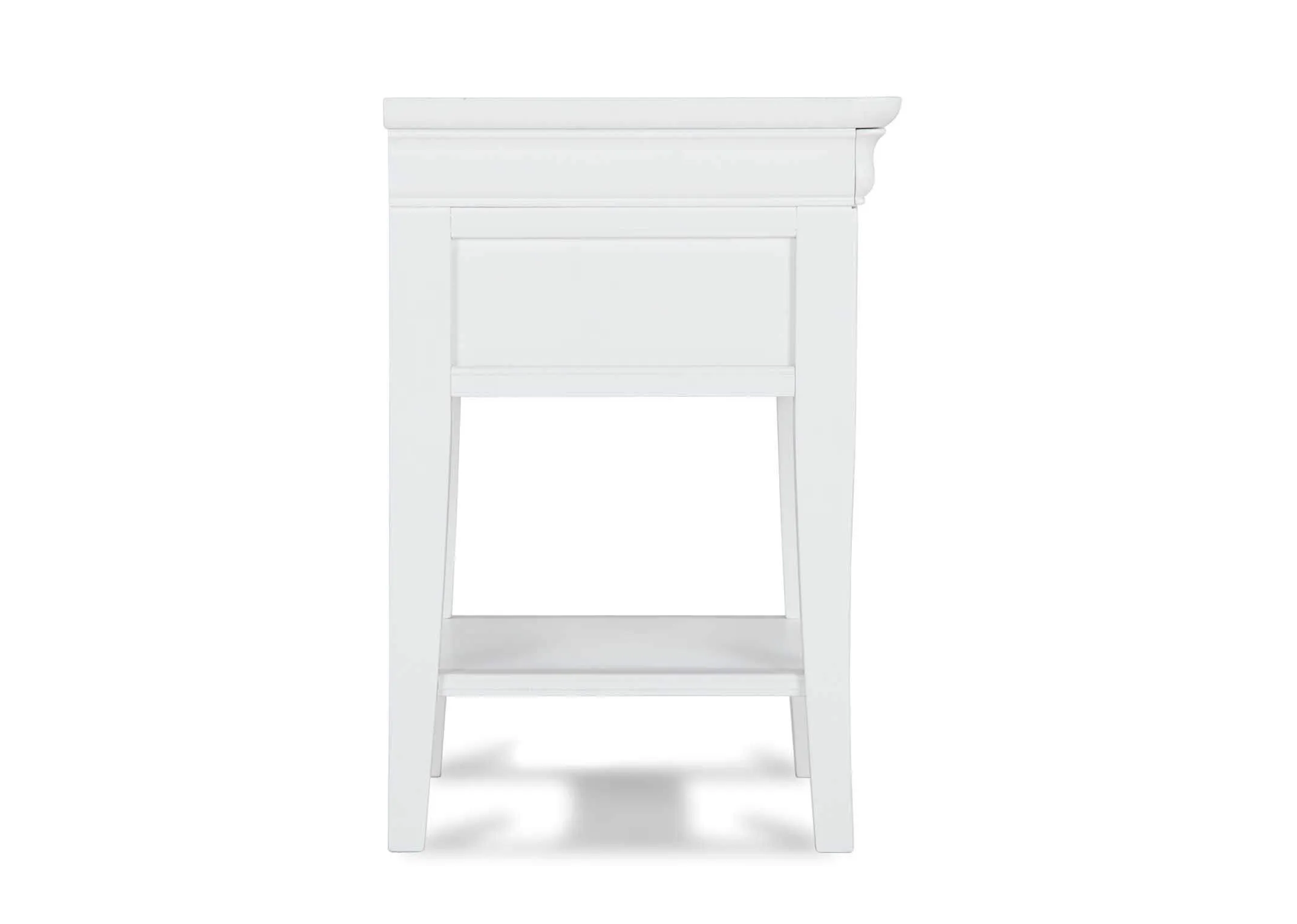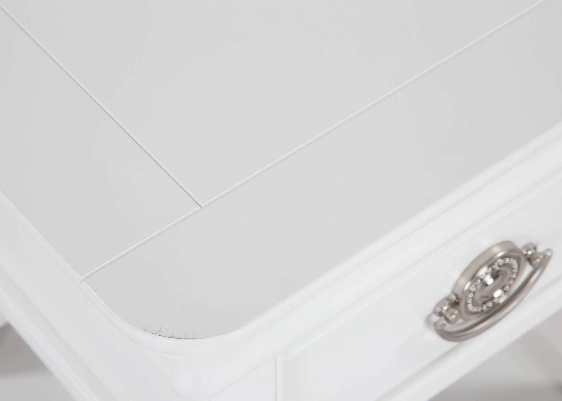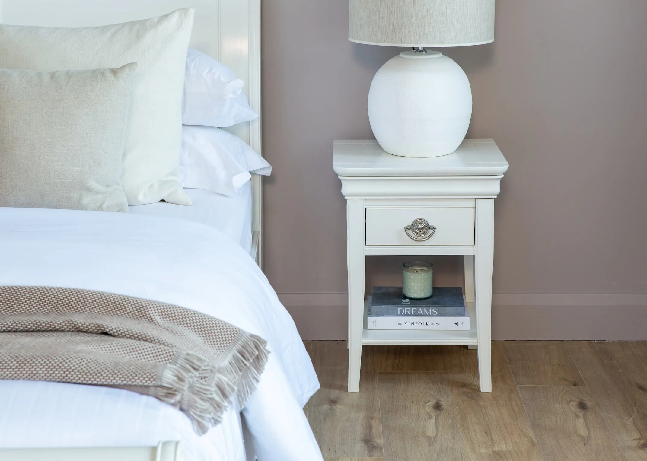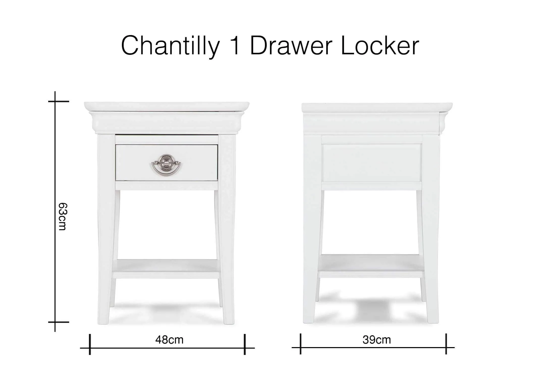 The Chantilly Bedside Locker is a white locker made from solid wood, with bespoke shield handles.