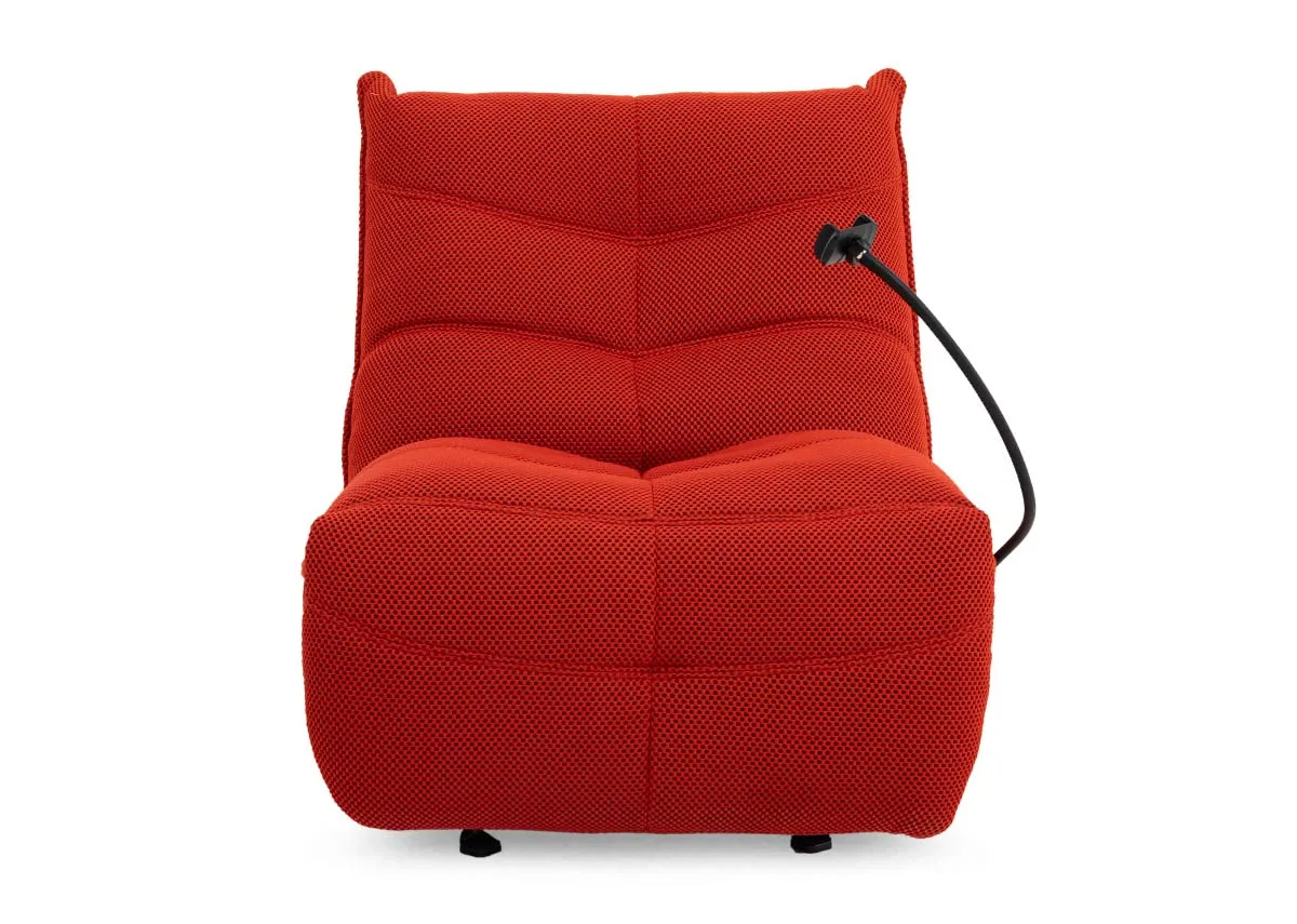 A bright red fabric power gliding gaming chair with thick foam filled seat for added comfort, a side pocket for remotes and handsets, usb charging port and a hands free phone holder.