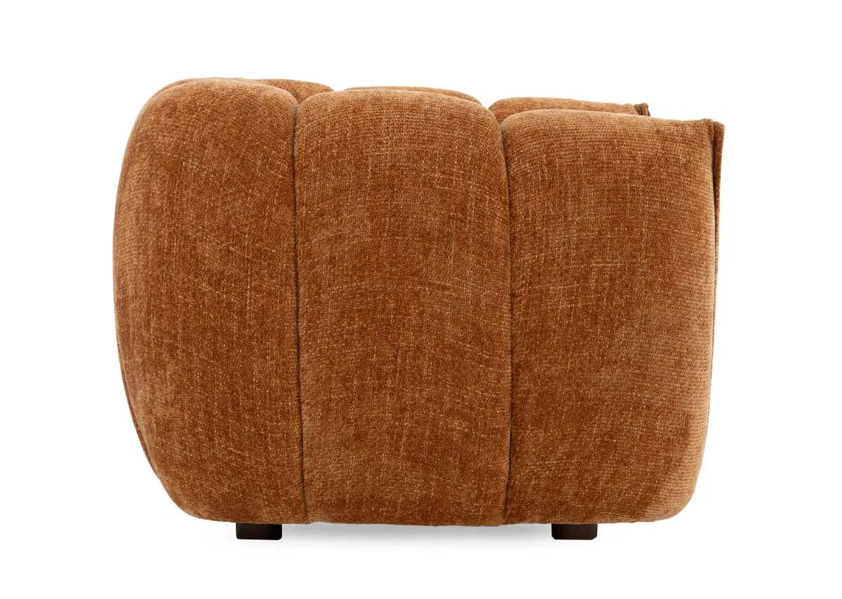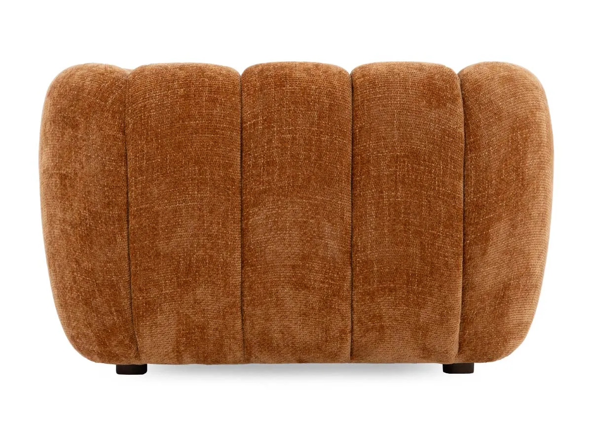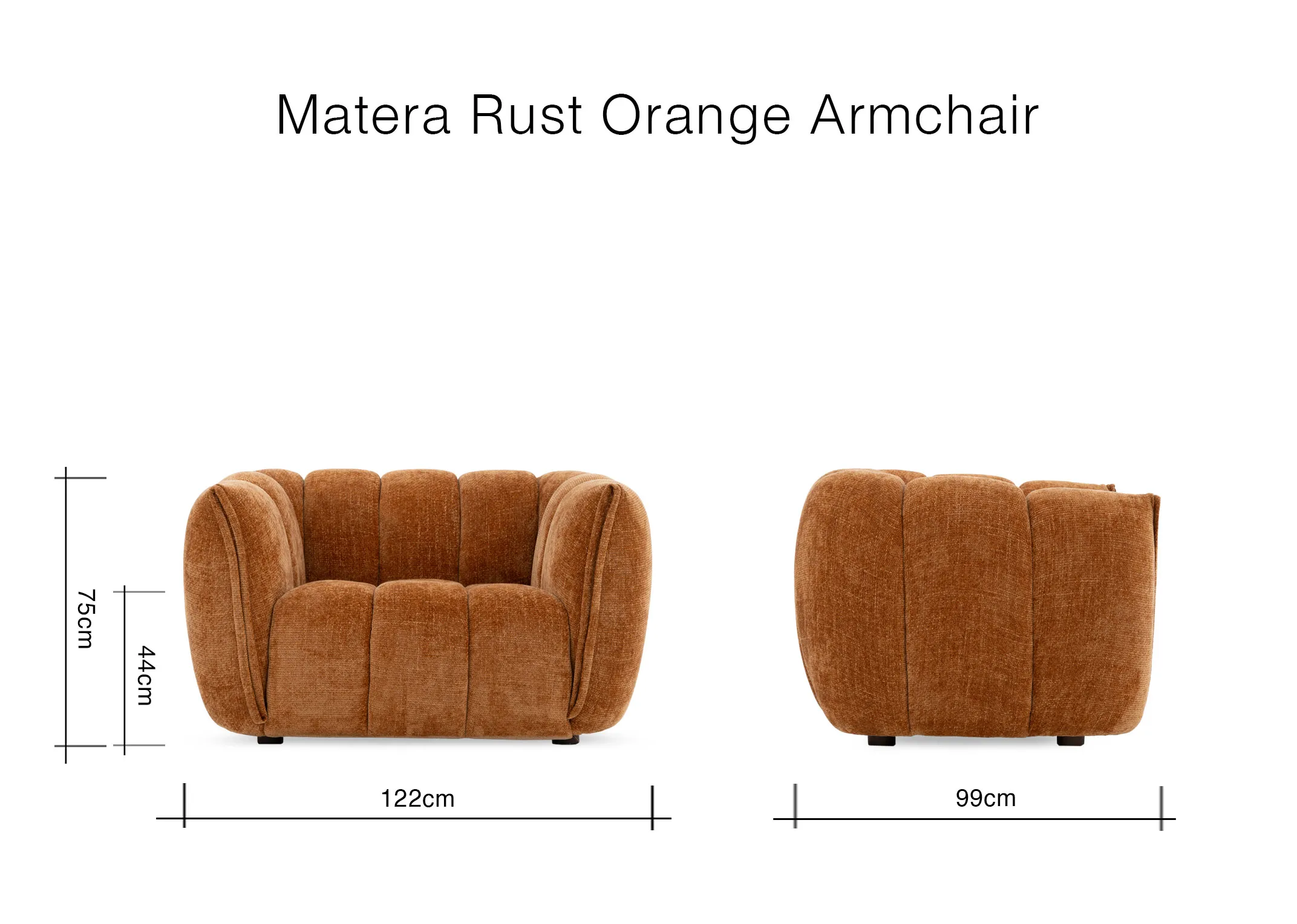 A bright rust armchair with gorgeous curving lines and densely padded seating upholstered in a warm fabric.