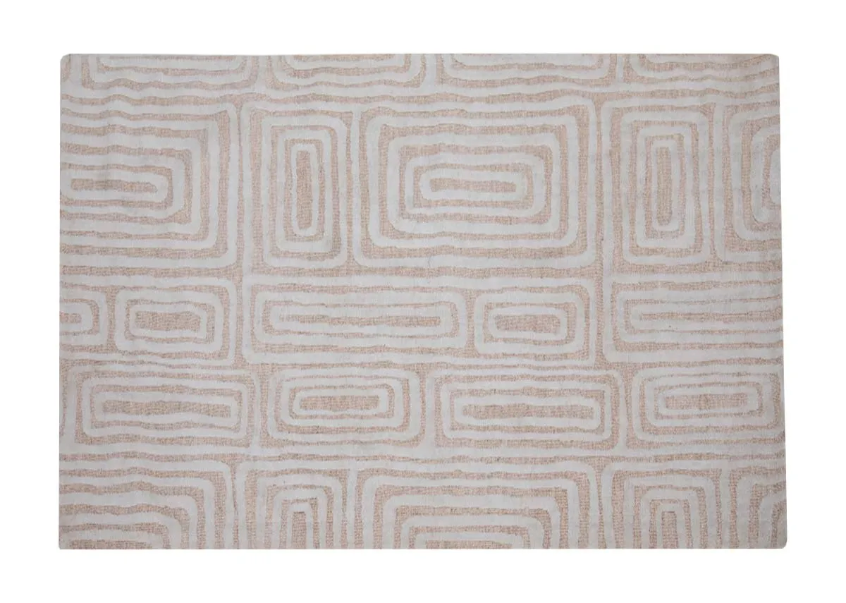A large natural sand rug with short pile with a geometric pattern of soft edged rectangles inspiring a bohemian style.