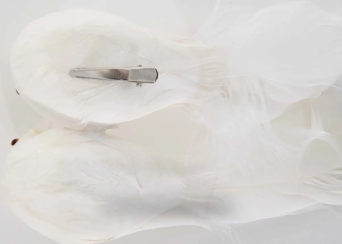 A set of 2 white doves strking with white feathers with a silver clip to add to your Christmas tree or wreath.