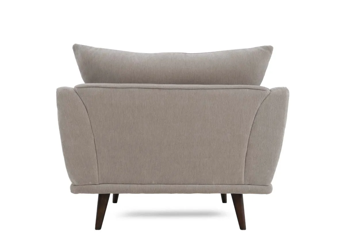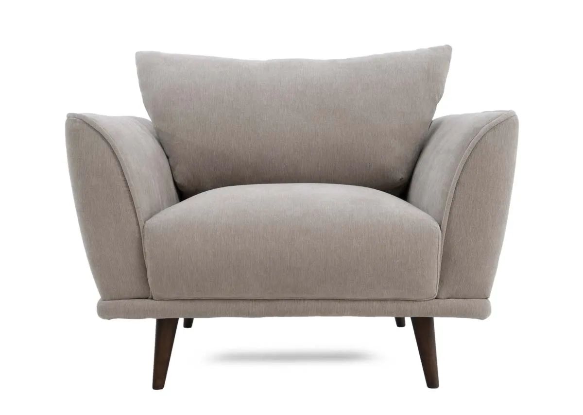 A large armchair, wide and upholstered in a silver with dark feet, retro in style.