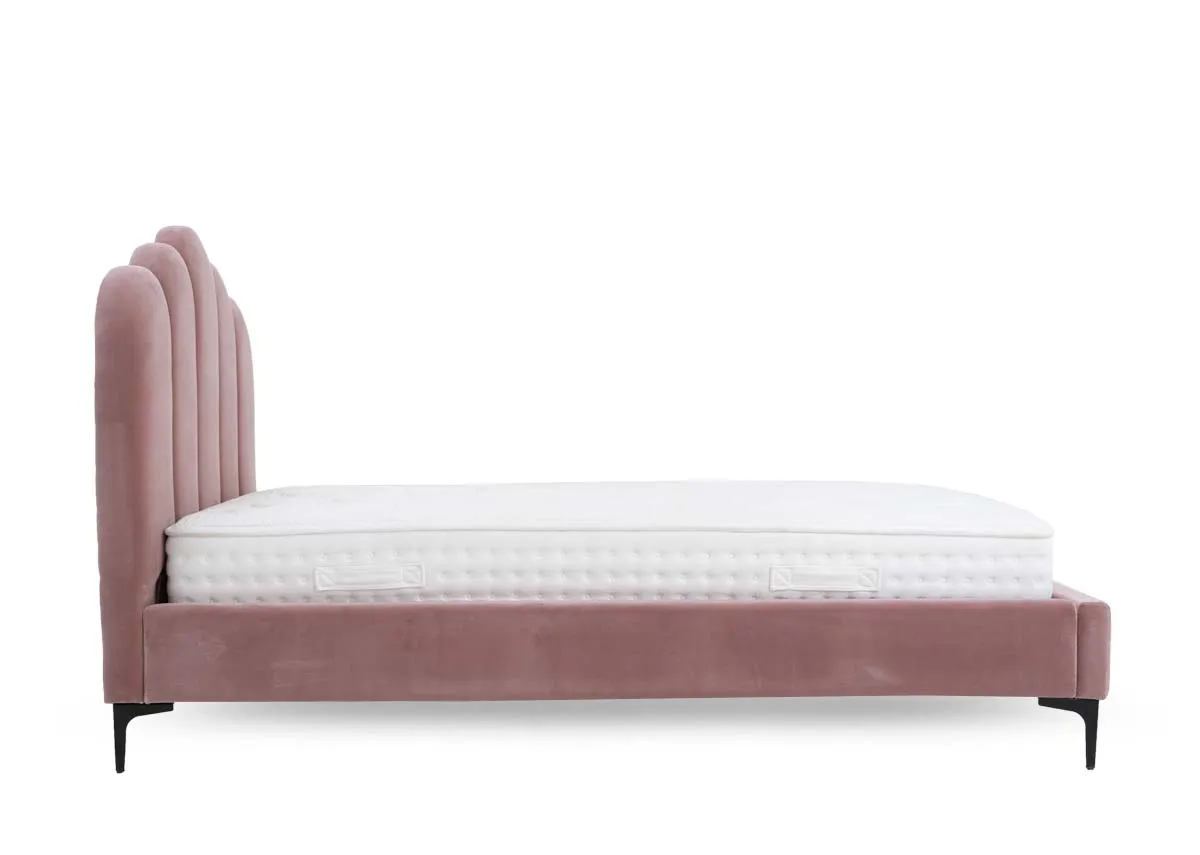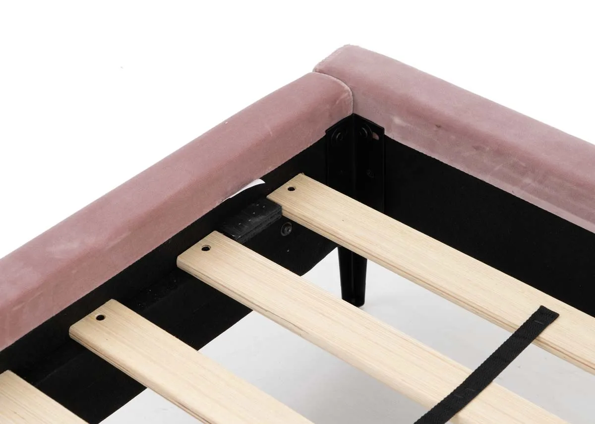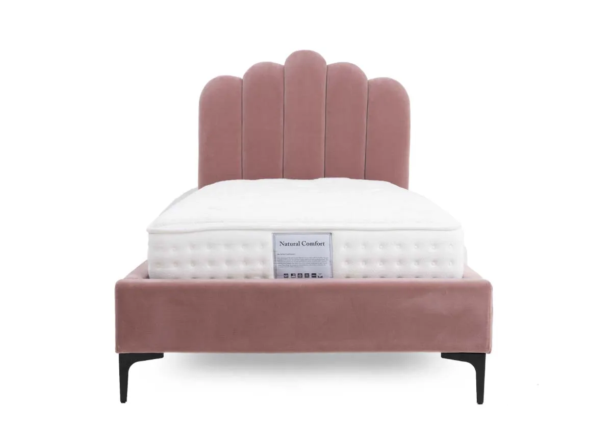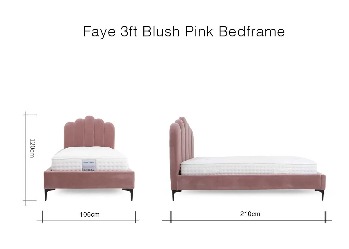 A 3ft bedframe with sides, foot and high scalloped headboard upholstered in a blush pink soft to the touch fabric.