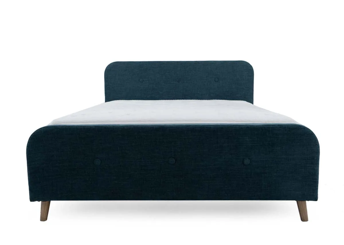A peacock teal fabric bedframe with arched low headboard, 3 tufted buttons on head and footboard and a slat wood base for a mattress.