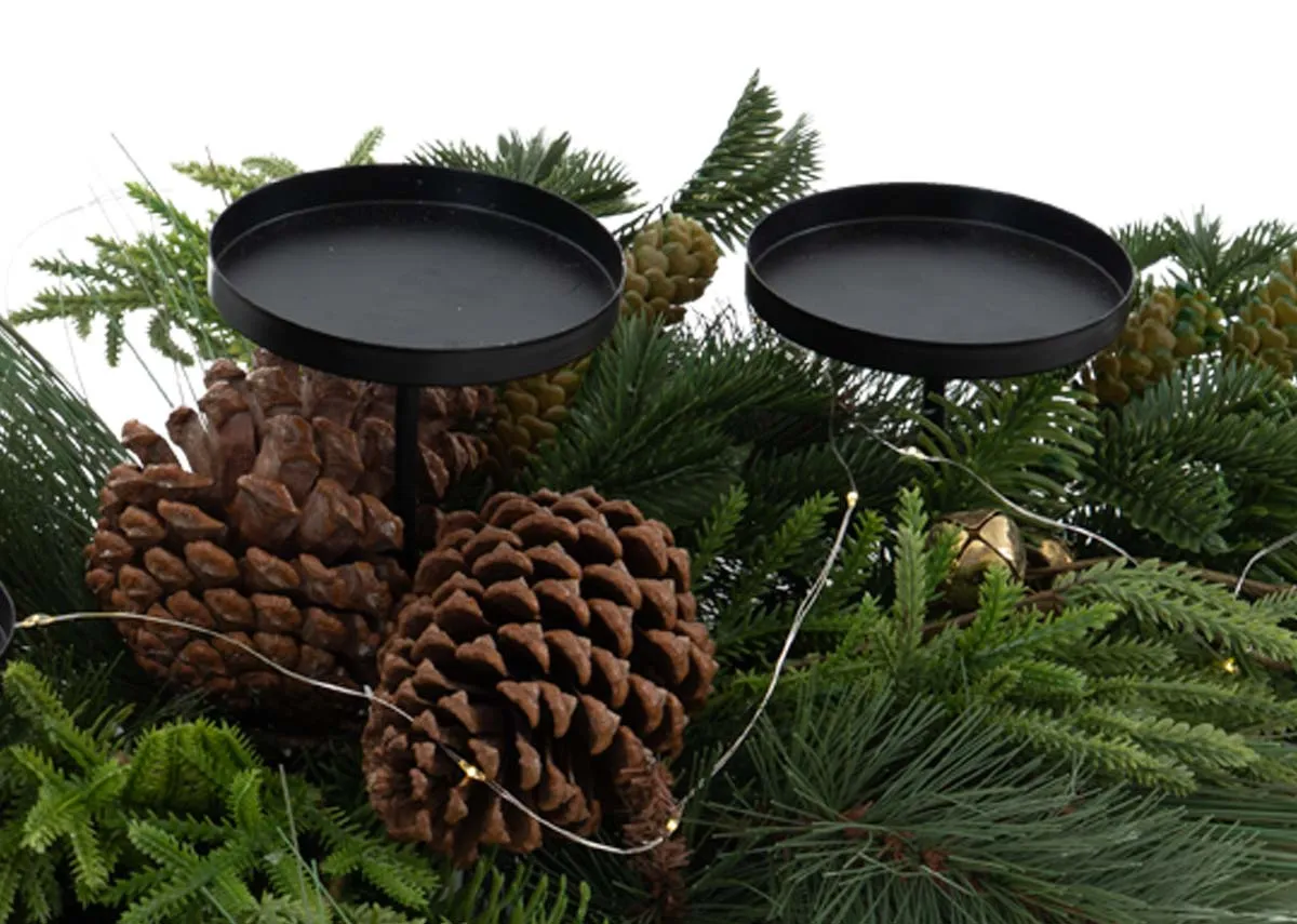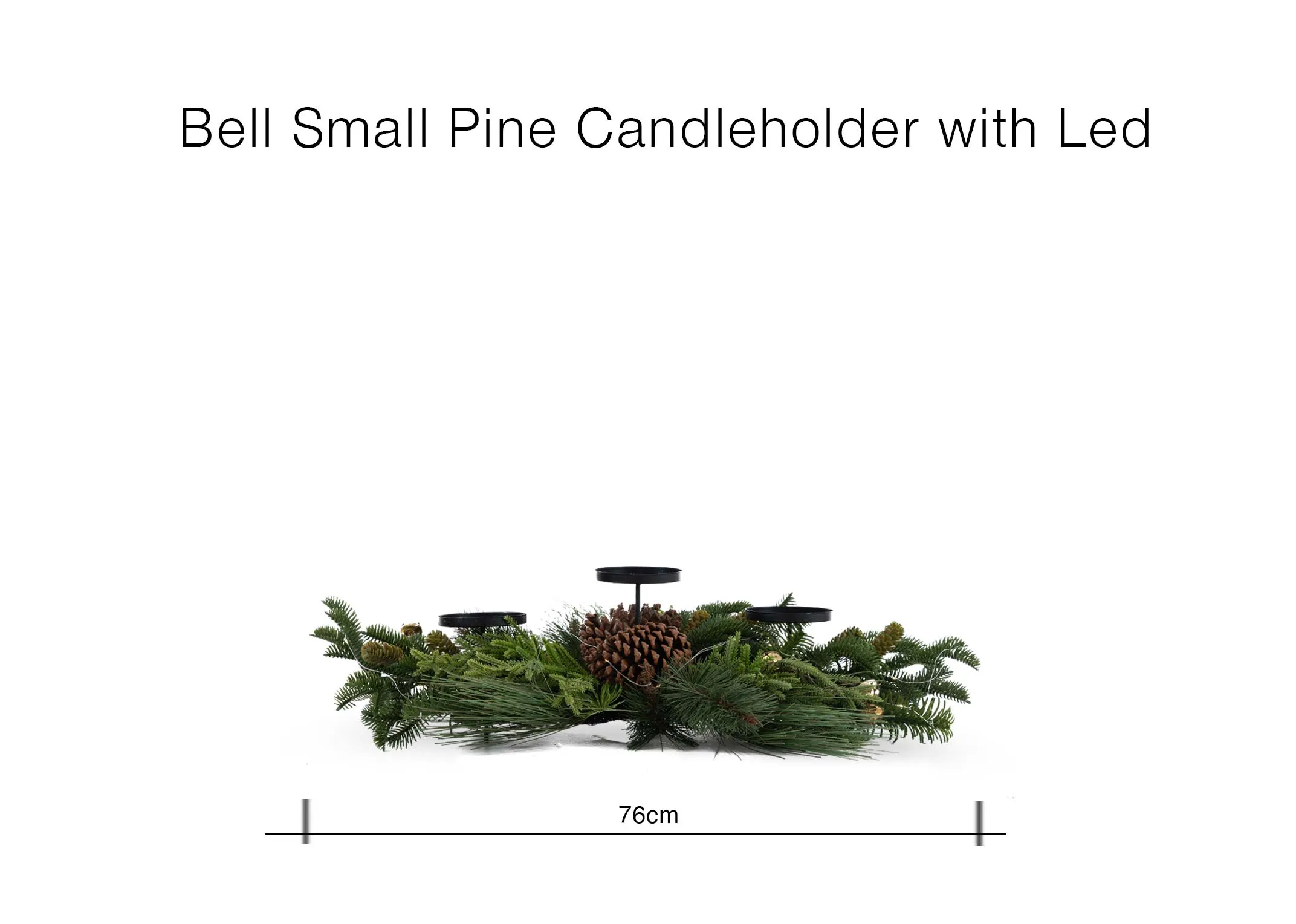 A small candle holder with artificial pines, cone and gold bells with led lights set in a metal frame with space for five pillar candles.