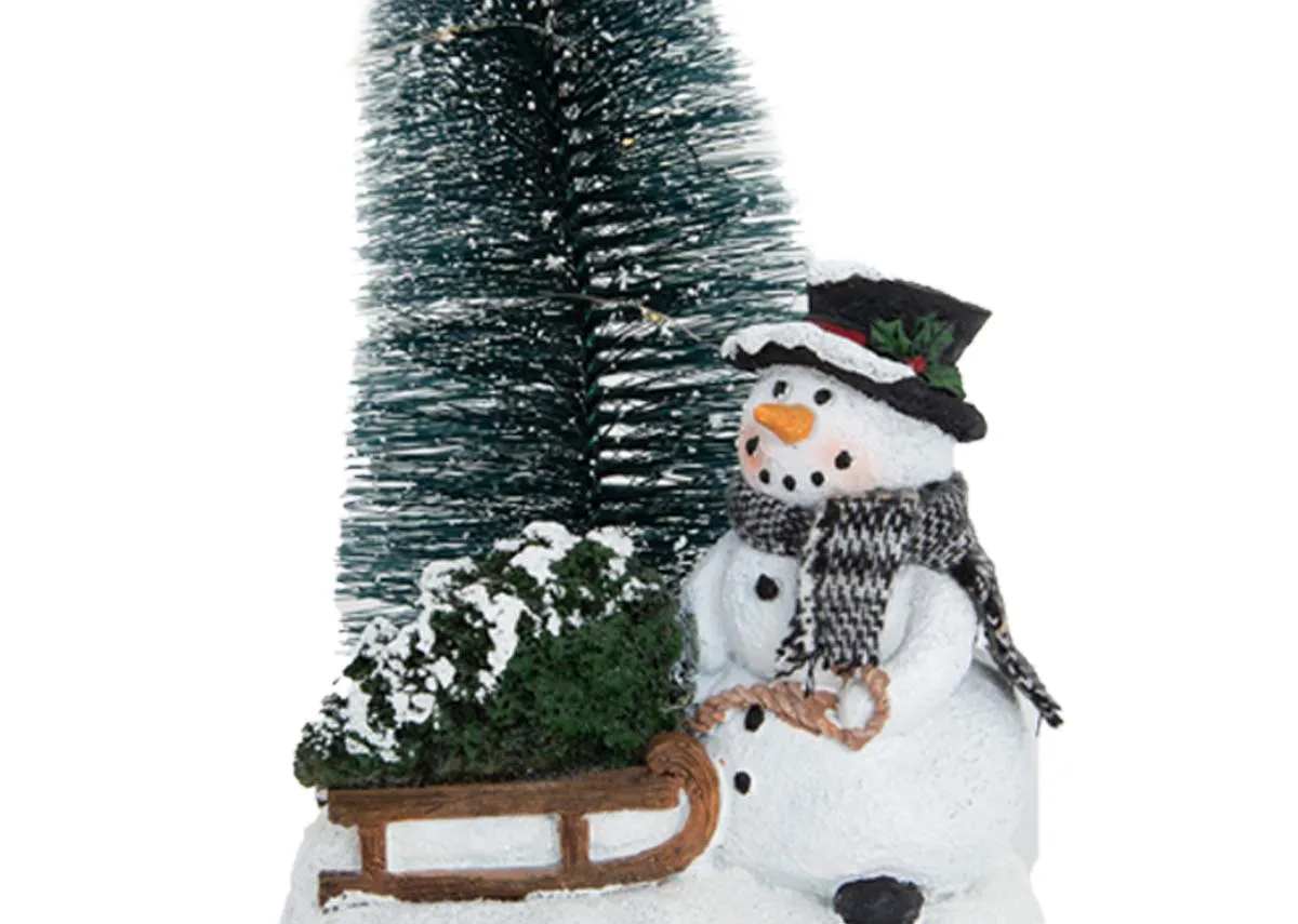 A snowman ornament dressed with hat & clock aboard a sleigh with a Christmas tree with lights