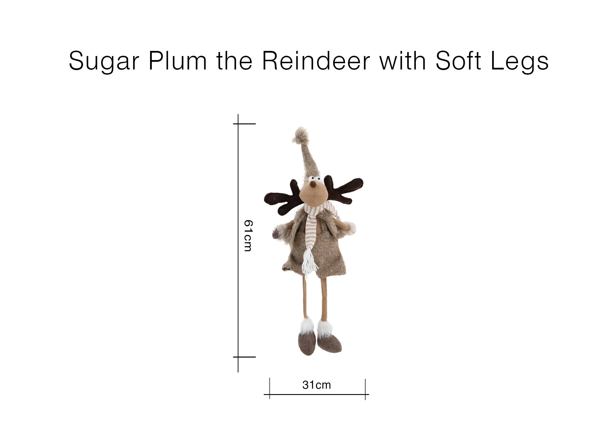 With his cheeky smile and cosy attire, Sugar Plum the Reindeer with soft legs is a wonderful Christmas character.