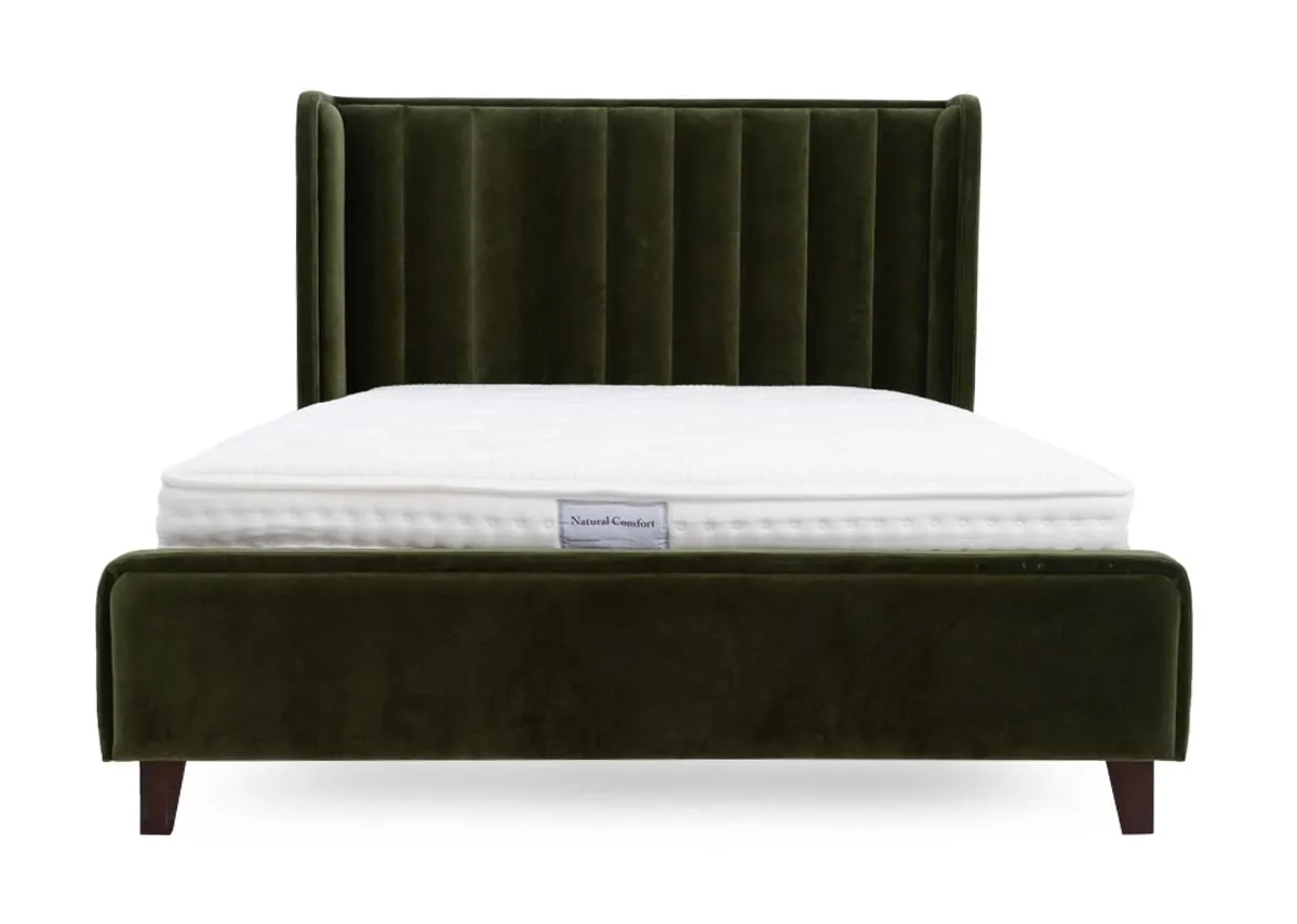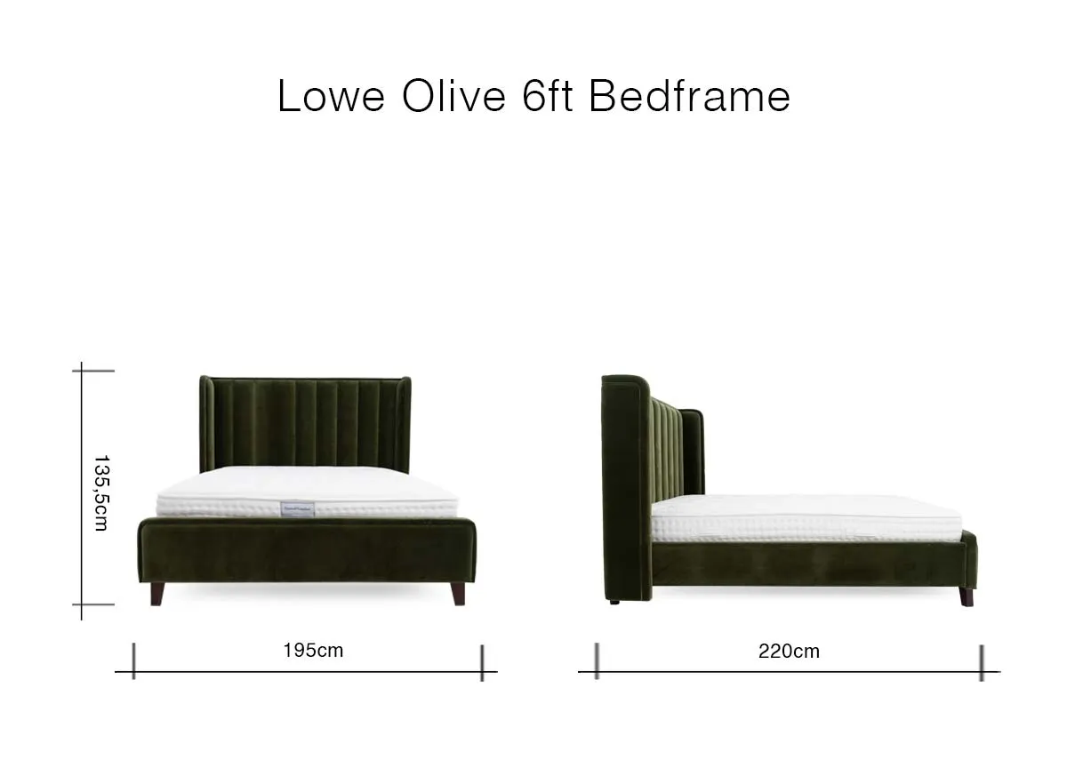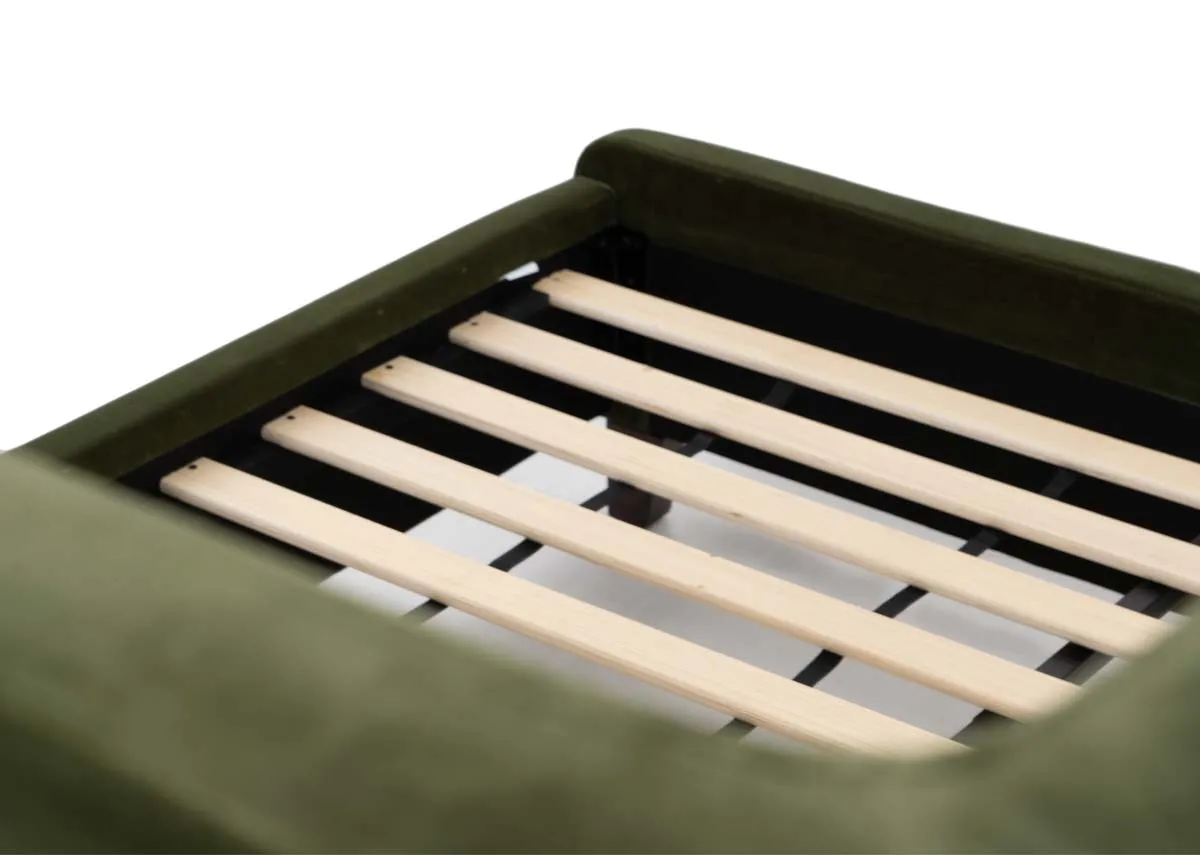 Beautiful in olive green the Lowe 6ft bedframe boasts a padded headboard with vertical panels, offering comfort and practical style.
