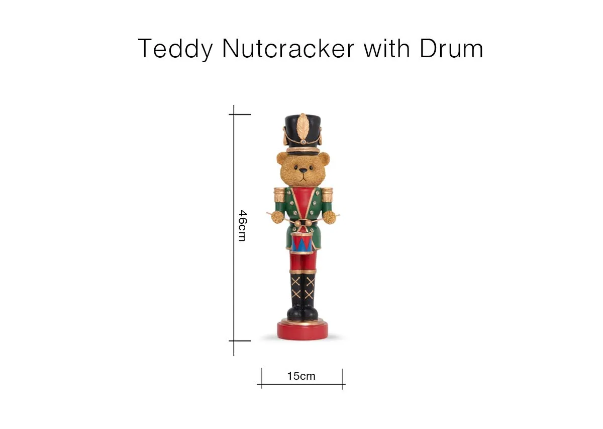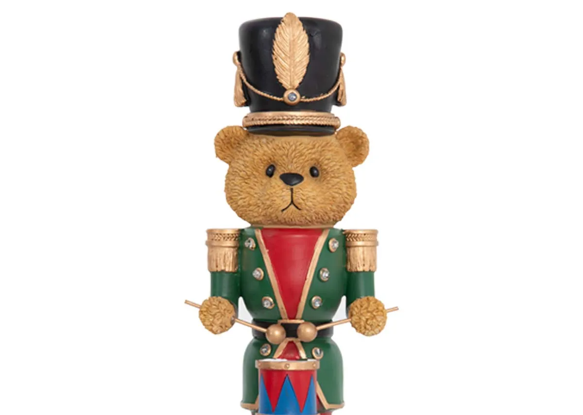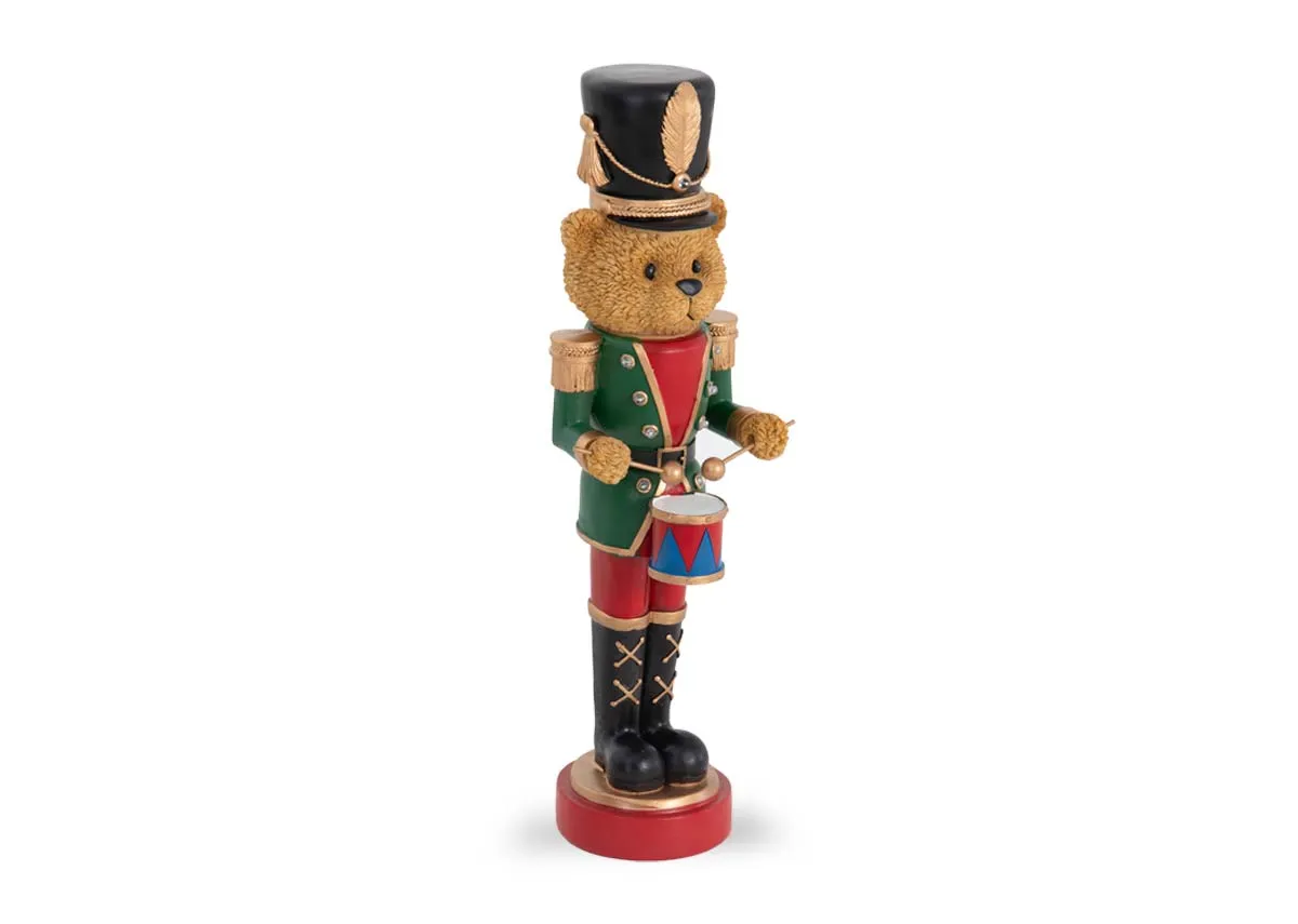 A teddy bear nutcracker dressed in traditional black hat & boots with green jacket while playing a drum.