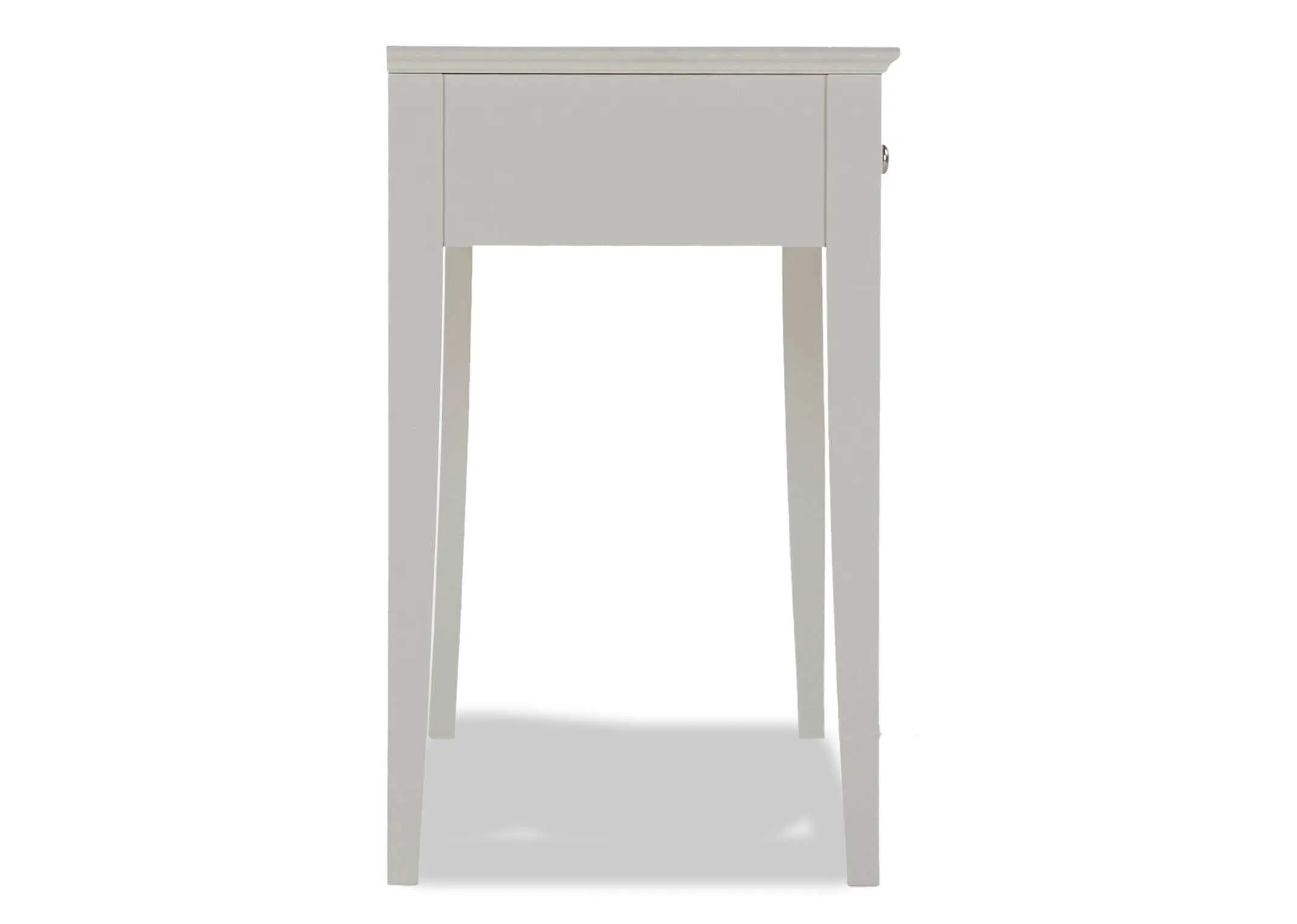 The Rivendale Dressing Table and Stool is a hardwood set with satin finish cotton paint, stainless steel handles, and an optional mirror.