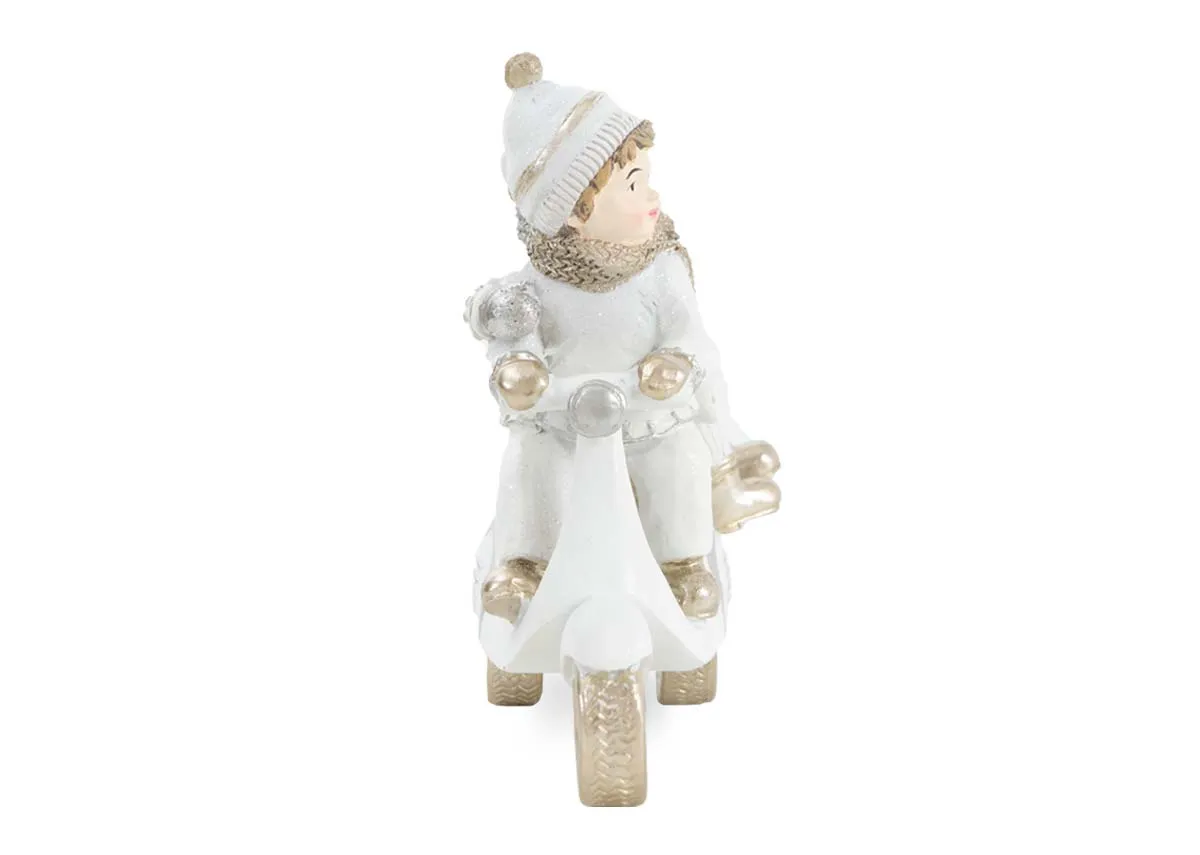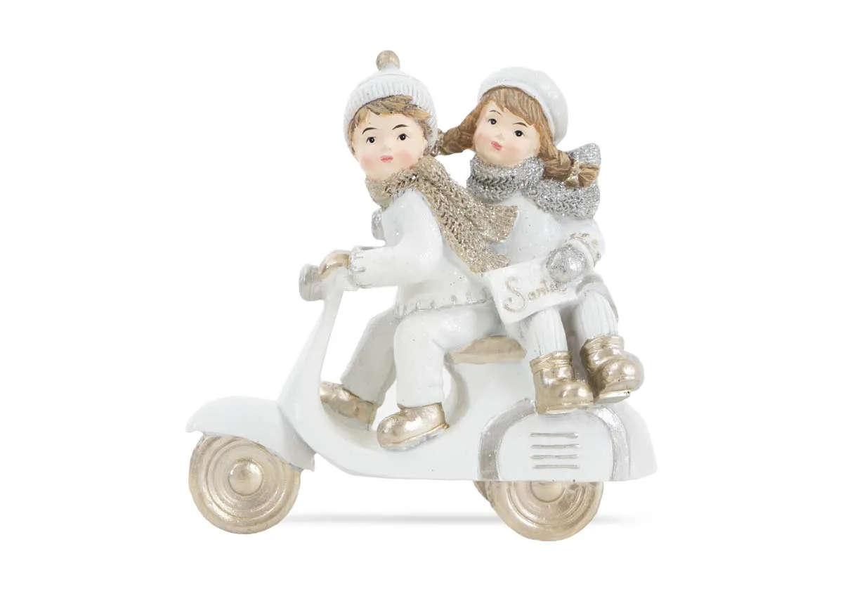 Little boy and girl figurines, wrapped up in winter clothing, sit on a scooter, delivering their letter to Santa Claus.