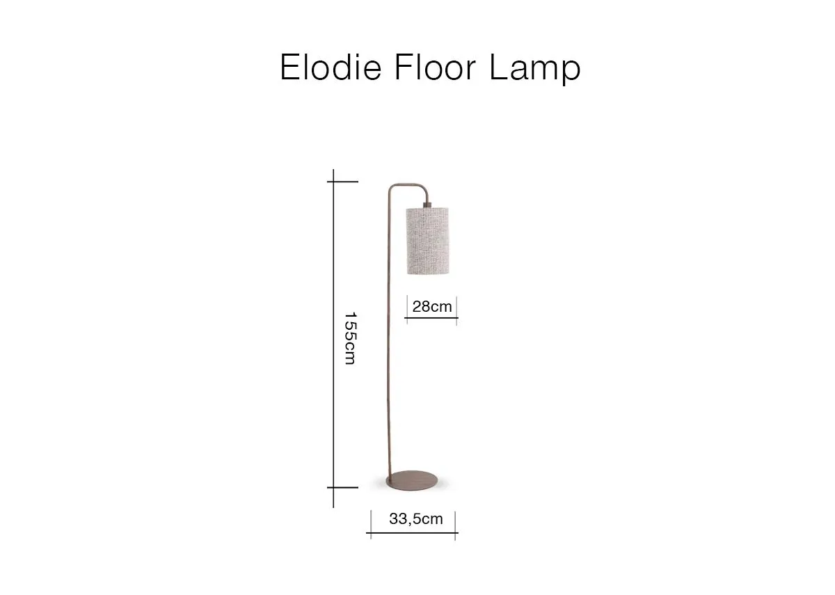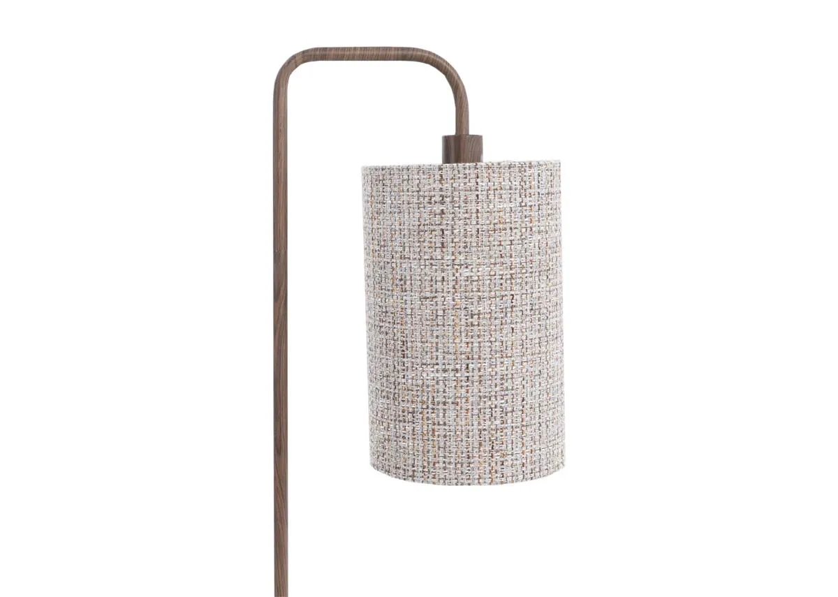A brown slim wood floor lamp frame with a cream tweed accent cylindrical shade, ideal for retro interiors.