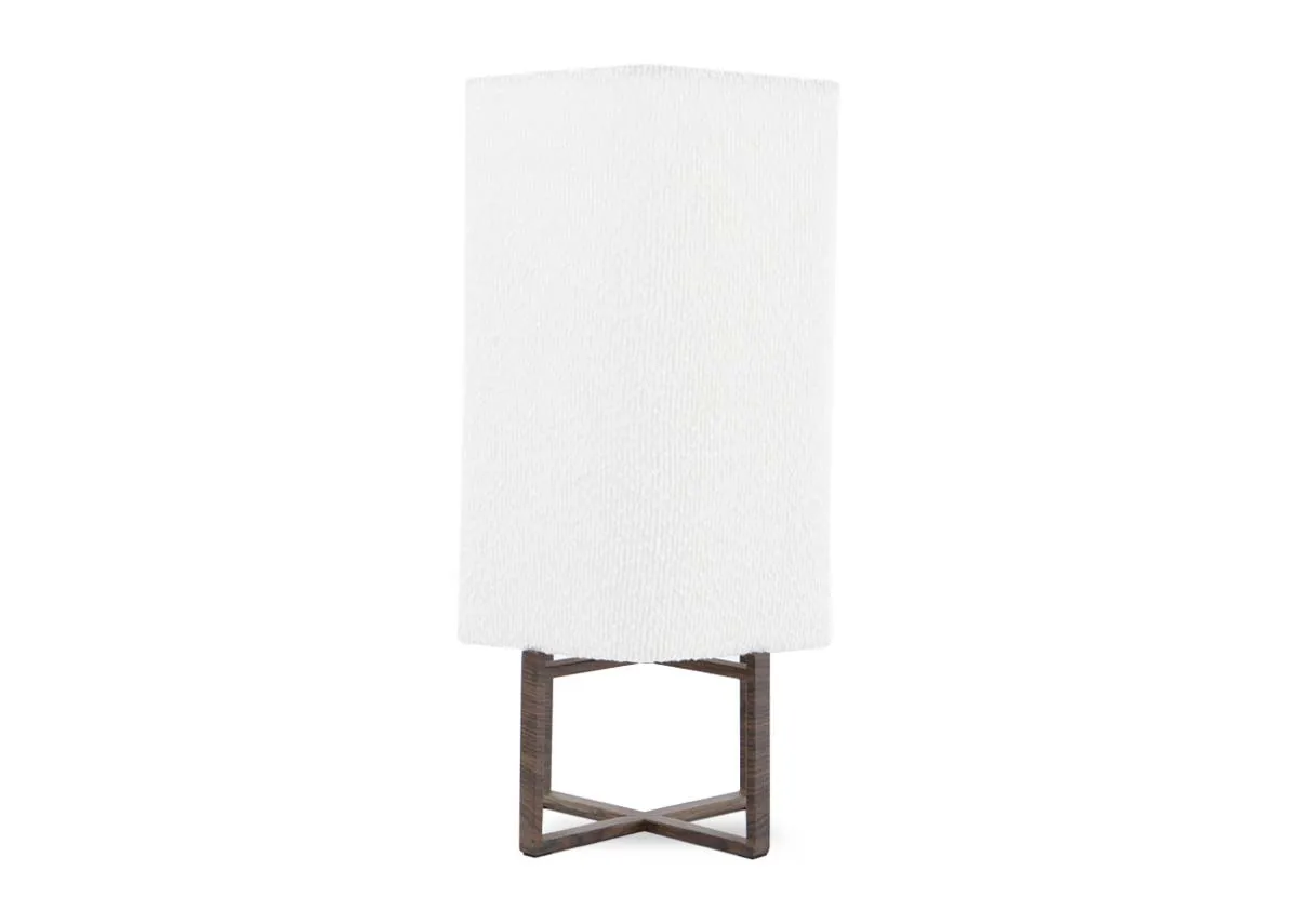 A petite ornamental wood base lamp with boucle tube shade ideal for a bedside or sofa table.